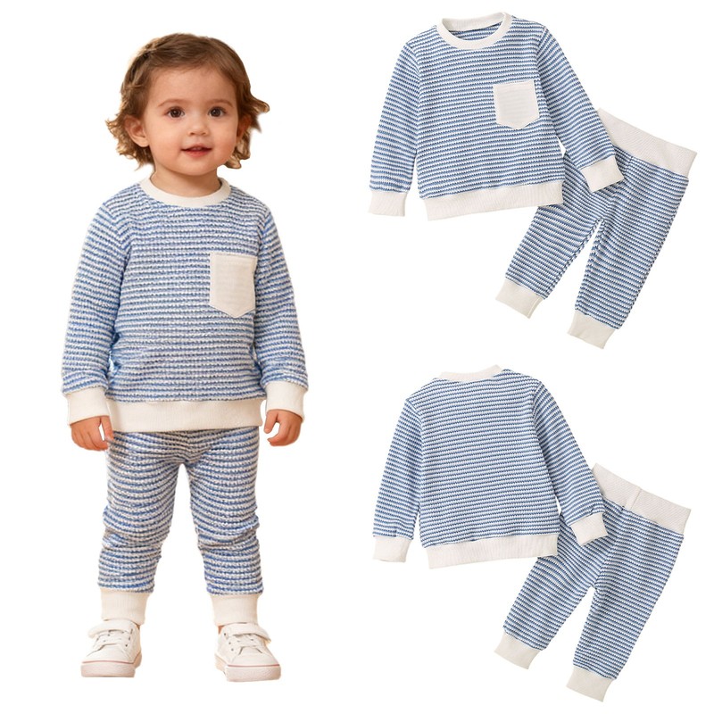 Striped design on the top and pants, a classic and trendy element, adds a fashionable touch to the outfit.