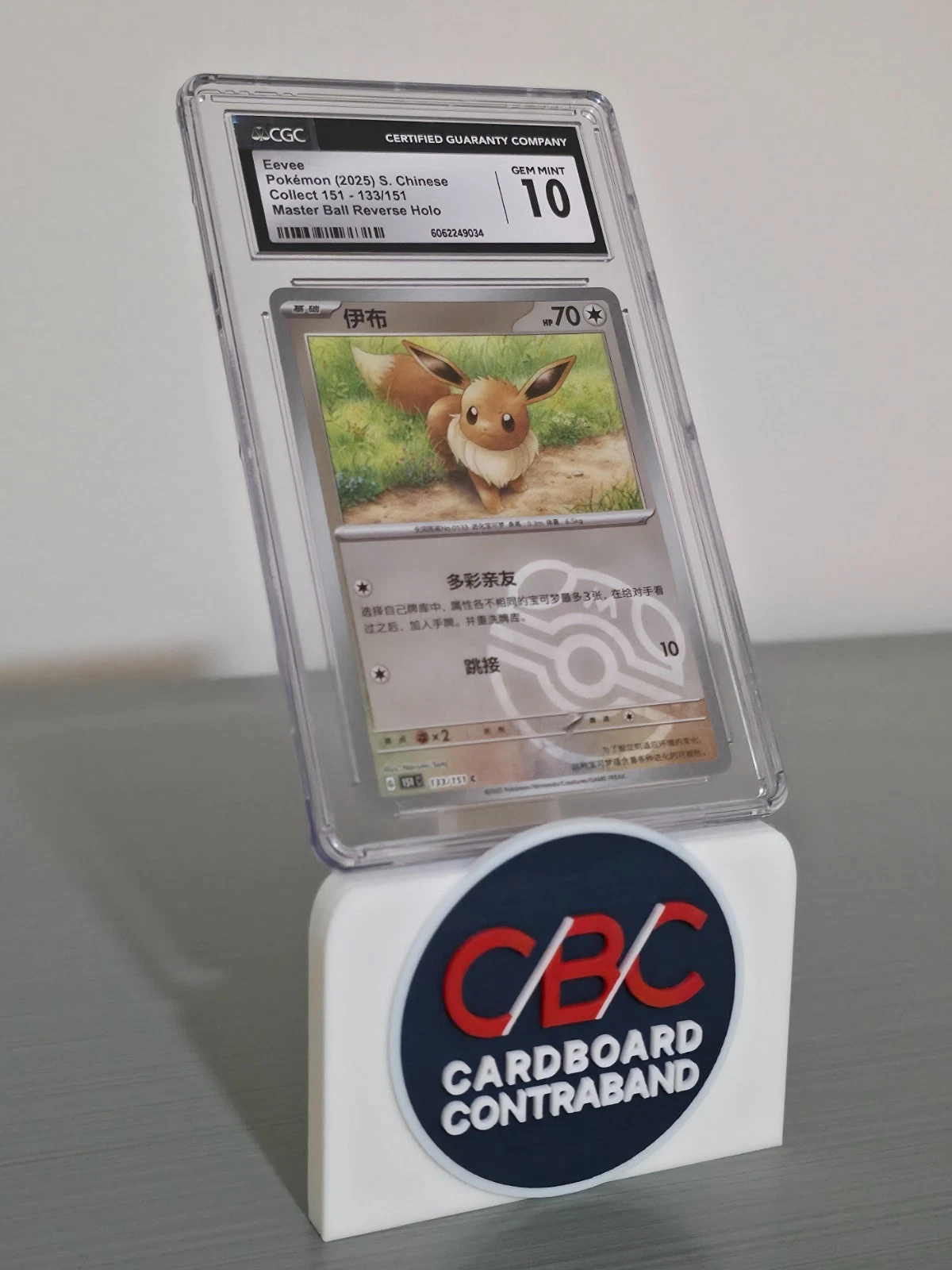 This listing is for a CGC 10 GEM MINT Eevee Master Ball Reverse Holo from the 2025 Pokémon Simplified Chinese 151C set, card number 133/151. The Master Ball reverse holo pattern is highly collectible and exclusive to the 151 series.