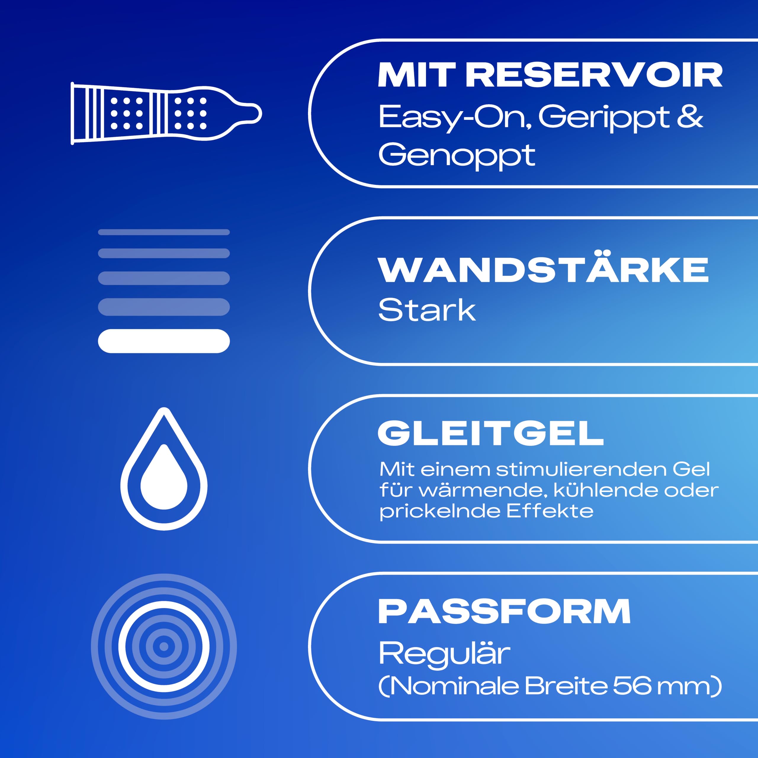 GERIPPT & GENOPPT FÜR PRICKELNDEN SEX: Die Durex Intense Kondome sorgen mit einer aufregenden Kombination aus Rippen, Noppen und viel Desirex-Gel für eine intensive vaginale Stimulation mit wärmenden, kühlenden oder prickelnden Effekten