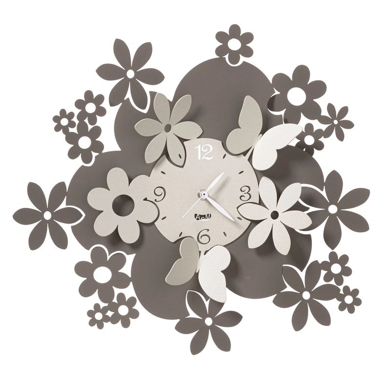 Orologio da muro Arti & Mestieri Daisy in ferro colorato decoro fiori e farfalle, disponibile nei colori fango, sabbia o avorio. Dimensioni 40 cm. Made in Italy
