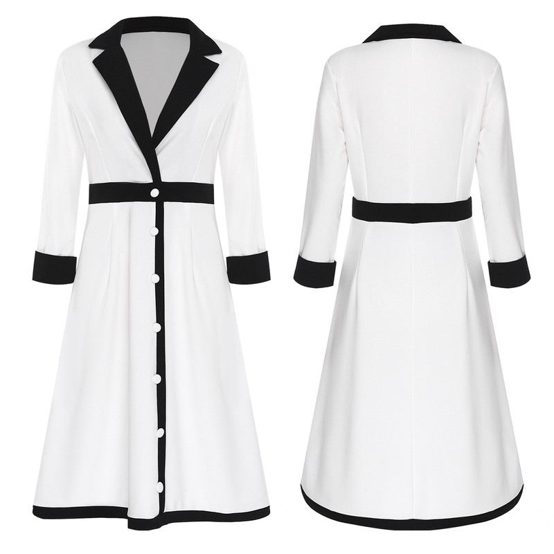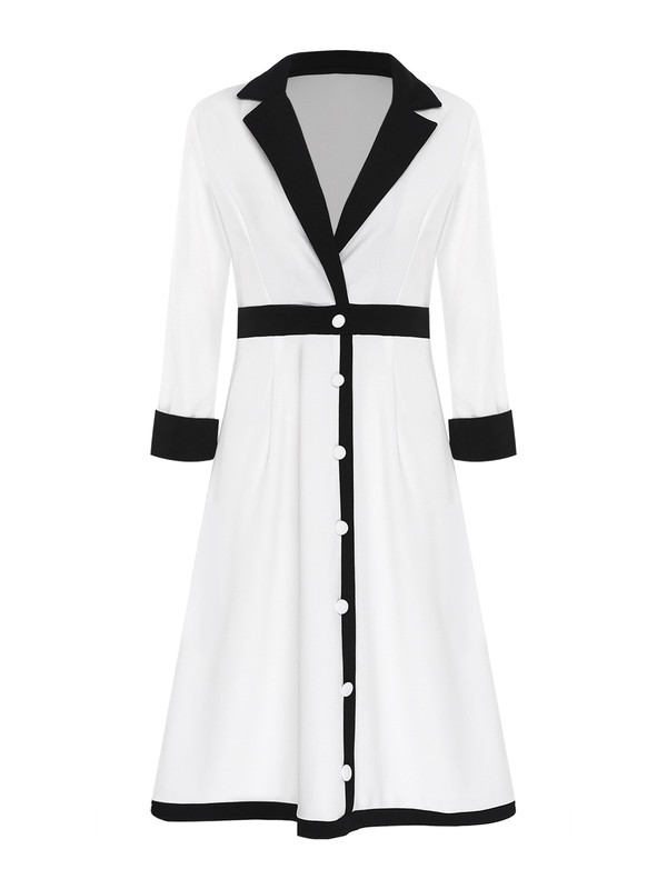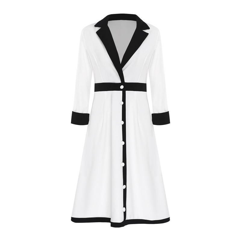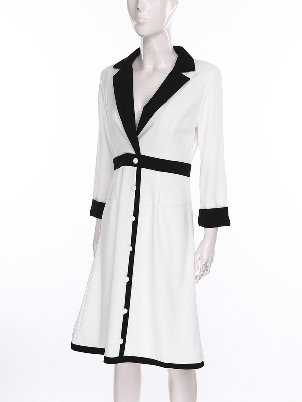 The lapel V-neck and decorative buttons add a touch of sophistication, enhancing the overall style of the dress.
