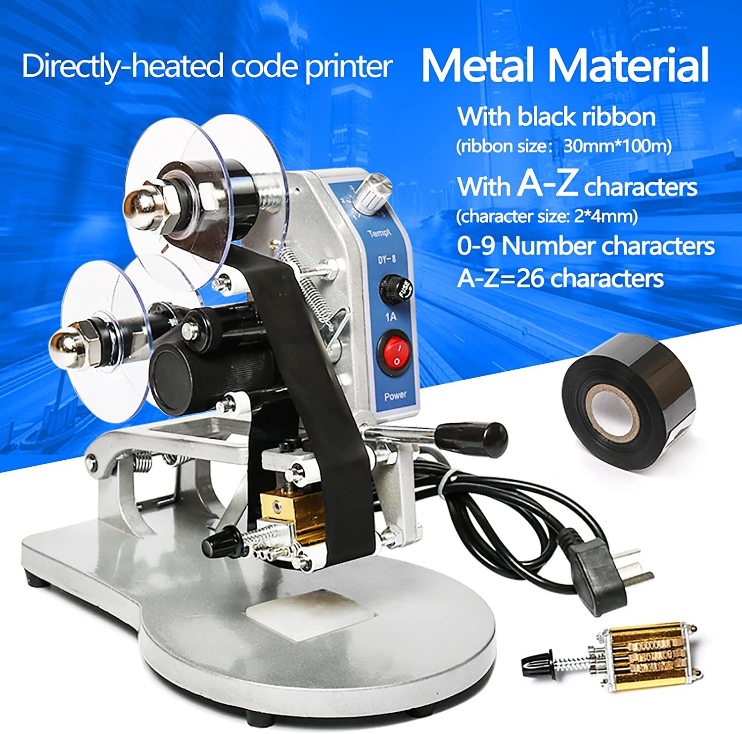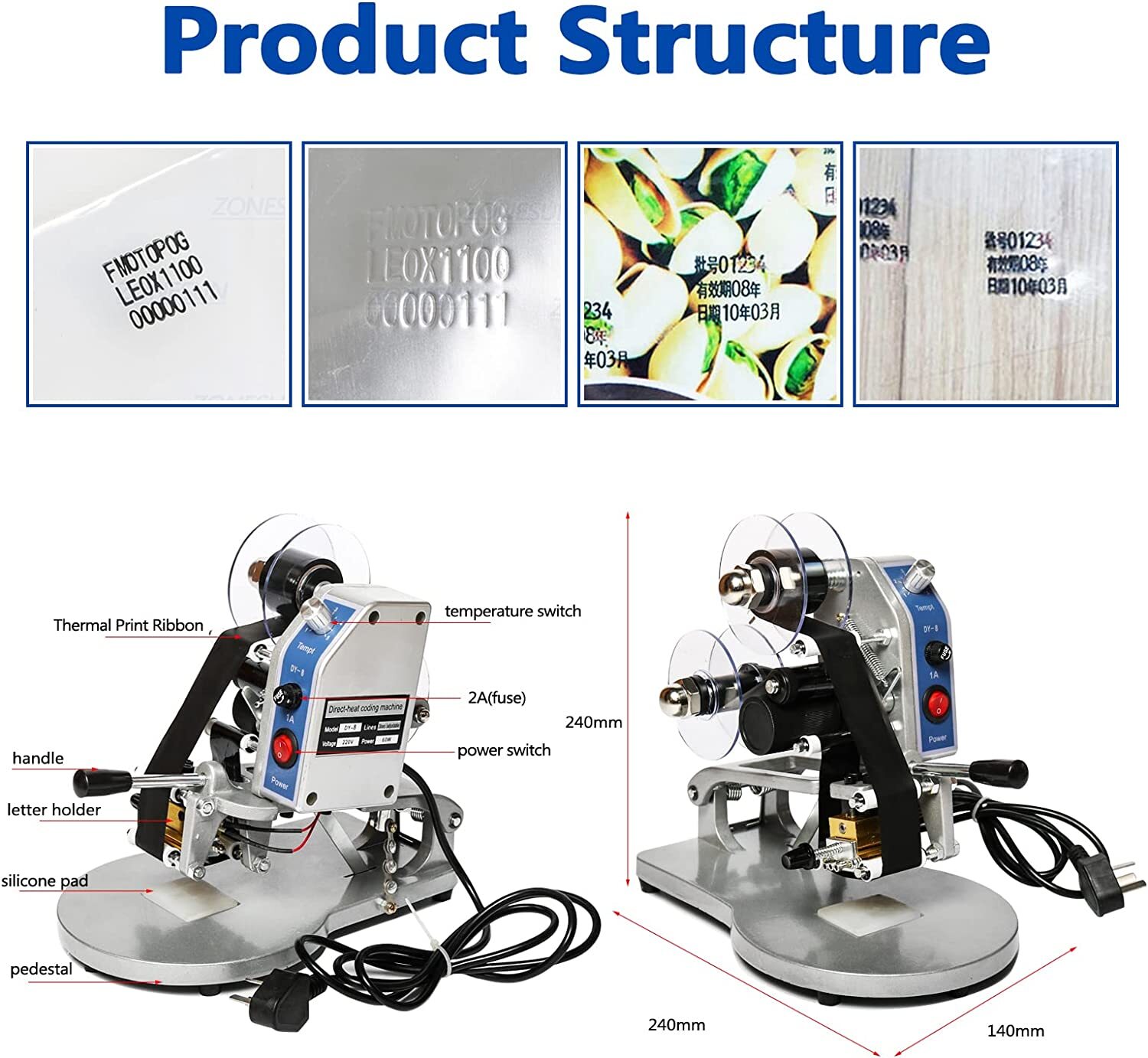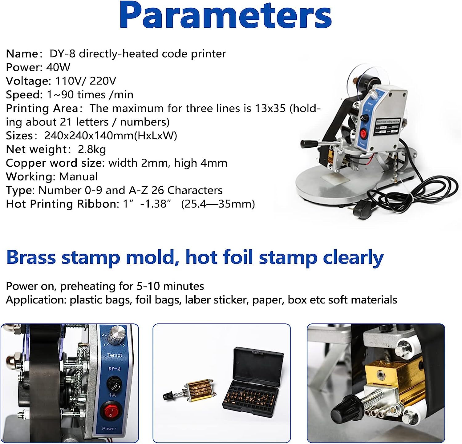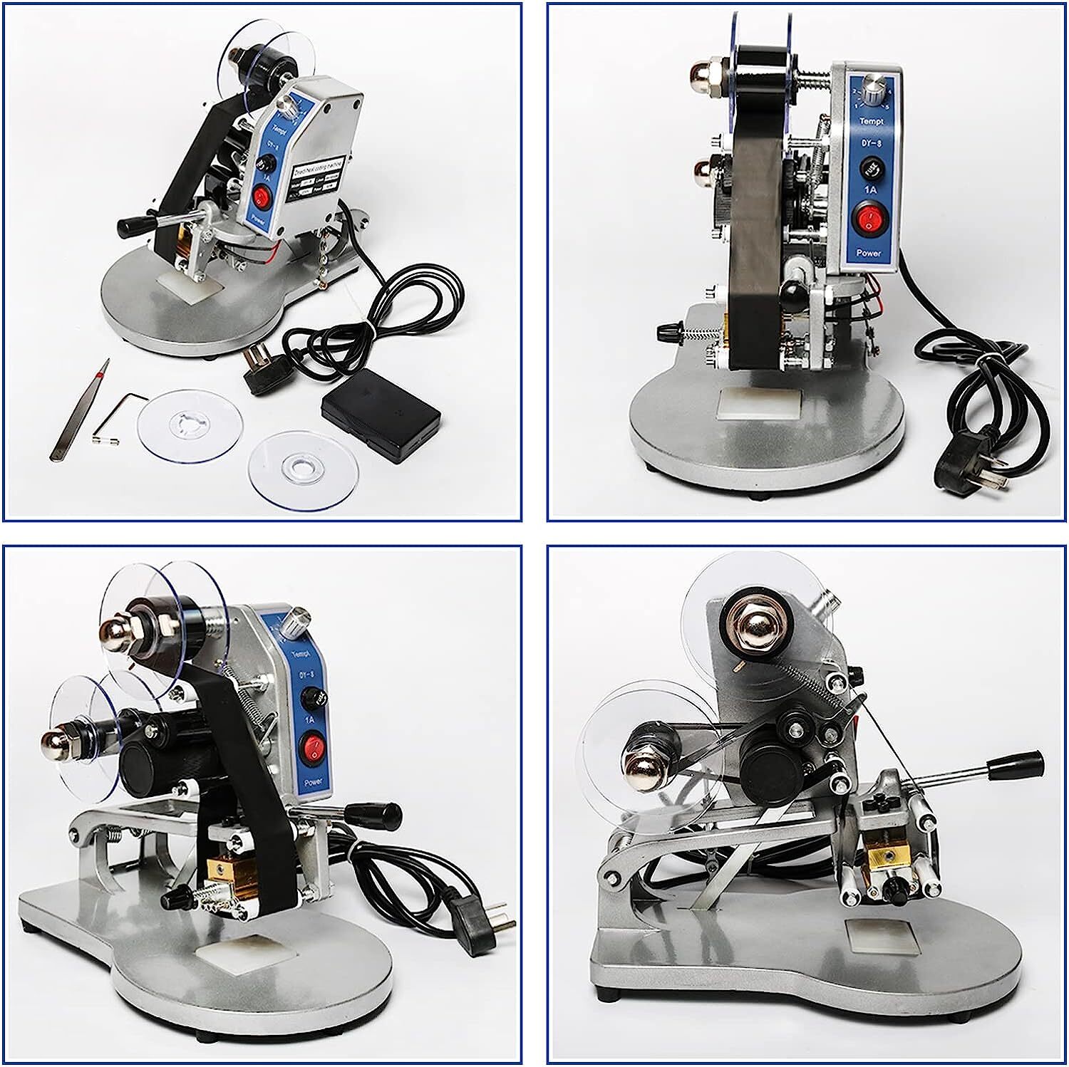 DY-8 Date Coding Machine Heat Printing Machine Manual Electric Hot Stamp Date Code Printer Semi Automatic Coding Machine Date Label Heat Machine for Plastic Film Flexible Packaging(EXP,MFG,LOT,Date)