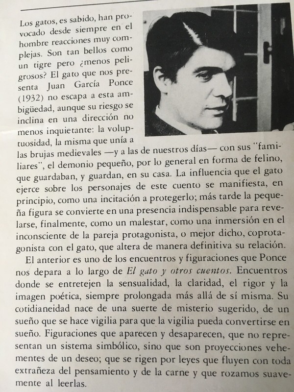 Los gatos han provocado desde siempre reacciones muy complejas en el hombre. El gato que nos presenta García Ponce no escapa a esta ambigüedad, aunque su rasgo se inclina hacia la voluptuosidad. La influencia que el gato ejerce sobre los personajes de este cuento se manifiesta, en principio, como una inclinación a protegerlo; más tarde invade la intimidad de los protagonistas hasta convertirse en un malestar que altera de manera definitiva la relación.