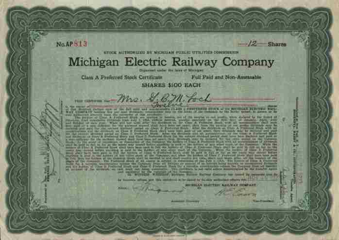 RARE Michigan - Aktie !! Einzelstück aus dem Jahr 1923 ### Orginalaktie -- rare Gründeraktie -- -- siehe Bild -- der Michigan Electric Railway Company , Stock Certificate über 12 shares (each 100 Dollar) , vom November 1923. STORY: The Michigan Electric Railway began operations in 1923 on a railroad route constructed by the Jackson City Railway of 1882. Over the years the interurban was known by different names such as the Jackson Street Railway, Jackson & Suburban Traction Company, Jackson Consolidated Traction Company and Michigan United Railways before known as the Michigan Electric. It remained in operation for only five years before being renamed the Jackson Transportation Company. Streetcar service ended soon after in 1936. Orginalunterschriften. Sammlerfreundlicher Sonderpreis !