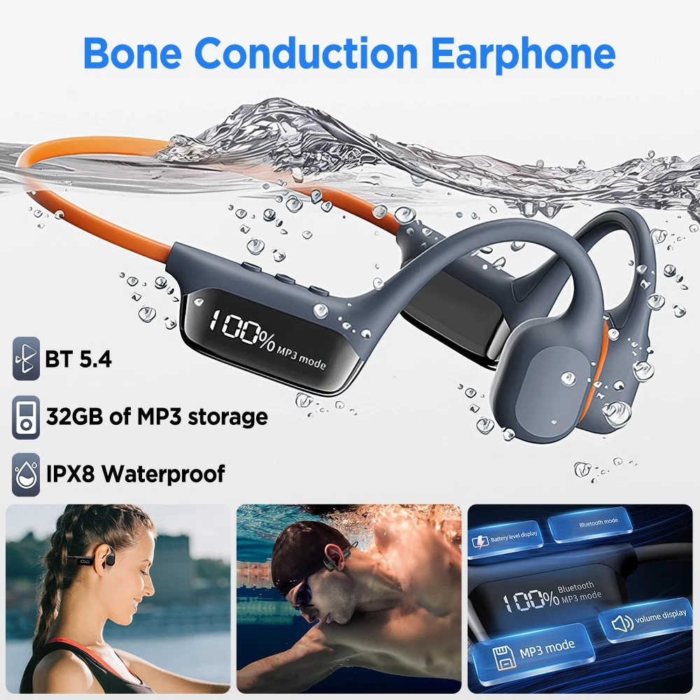 - 32G Memory MP3: These swimming headphones have a built-in 32G memory, which can store about 8000 songs. Bluetooth does not work underwater, so you can switch to MP3 mode while swimming. So you can enjoy your favorite music and audiobooks underwater.