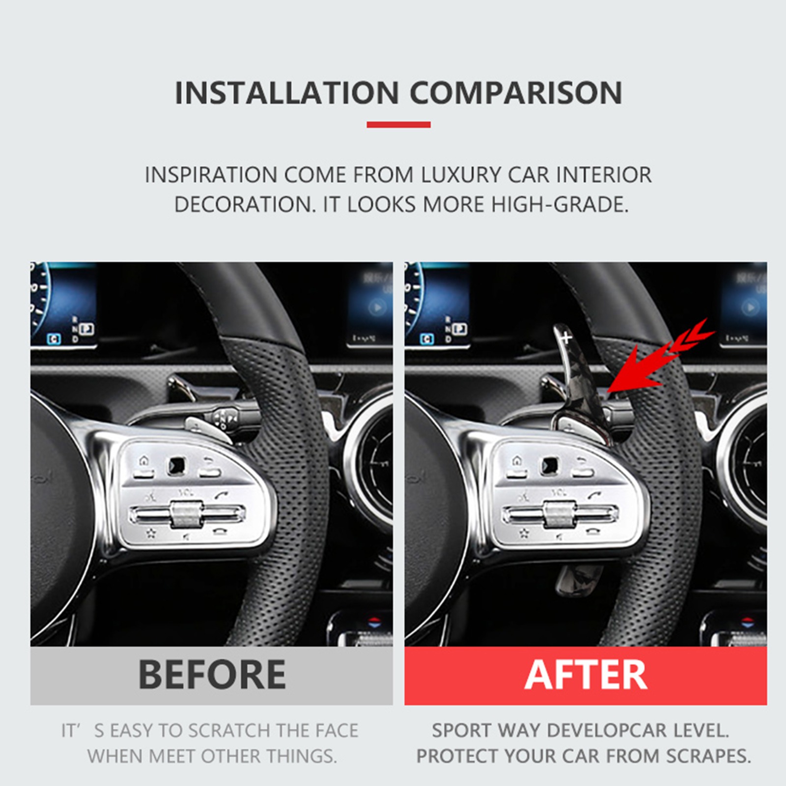 Easy to install, fit behind the original left/right paddle shifters using the included double-sided adhesive with no modifications required. No damage to your car.