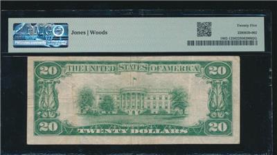 Here is a $20 Type I small size National Bank Note. It is charter #13044, the Bank of Italy National Trust and Savings Association San Francisco, CA. This is the former name of the same Bank of America that is a bank still today! It has been graded by PMG as Very Fine 25. The Freidberg number happens to be 1803-1.