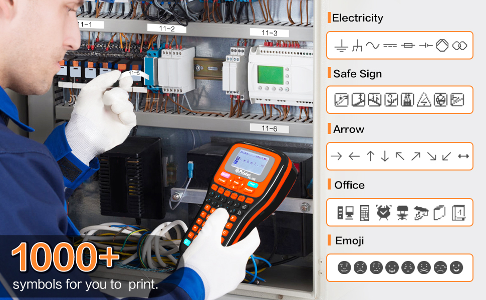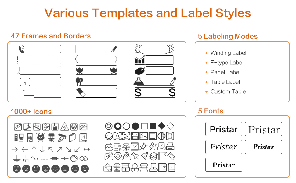 - One-touch Keys more Easy to Use - The shortcut keys of the Pristar PS-100E labeling machine printer, such as copy and paste, enable fast typing and simple use. The operation of one-touch keys provide you with 1000+ symbols and borders, as well as various templates for printing TZe 0.13"(3.5mm) / TZe 0.23"(6mm) / TZe 0.35"(9mm) / TZe 0.47"(12mm) label tape. The backlit display screen make it convenient to work even in dark environments.