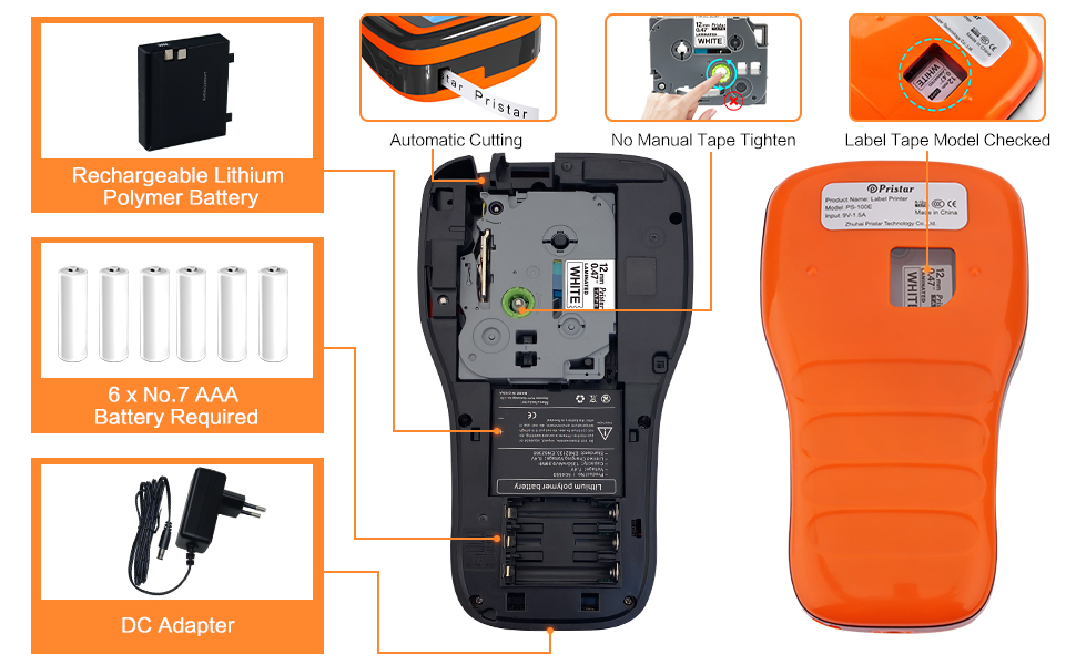 - Three Power Supply Methods - Pristar PS-100E portable handheld label Maker can be powered by DC Adapter with rechargeable lithium polymer battery (included) or 7 AAA battery (not included), three power supply methods double the working time of the machine, allowing printing to be performed anytime and anywhere in different environments and scene conditions.