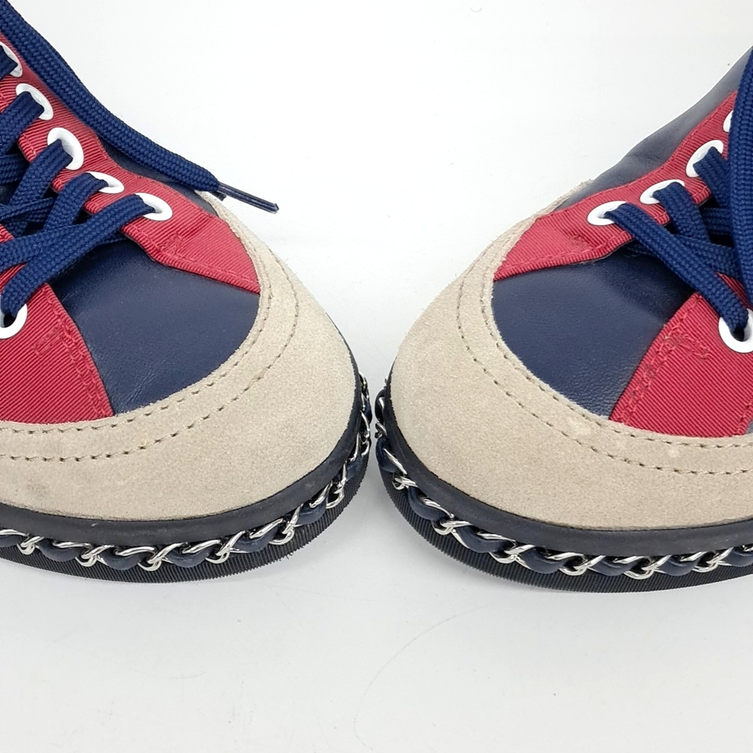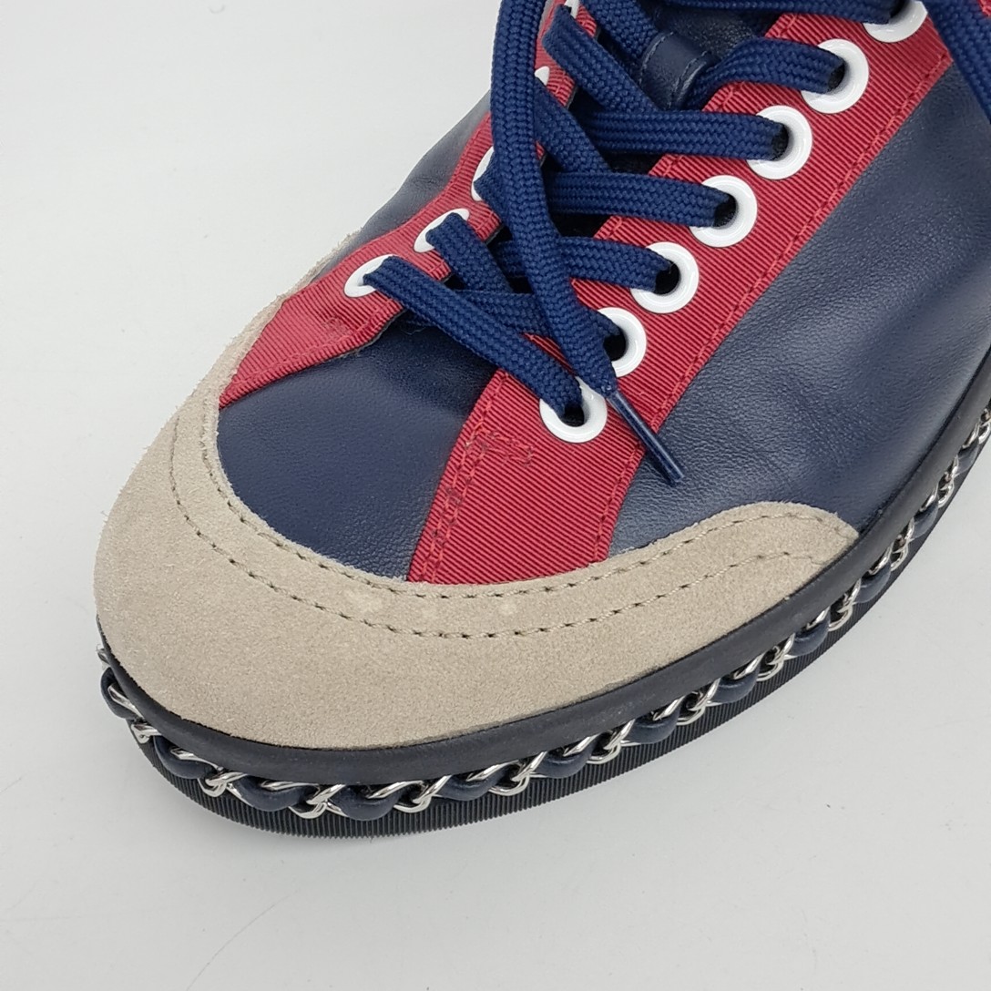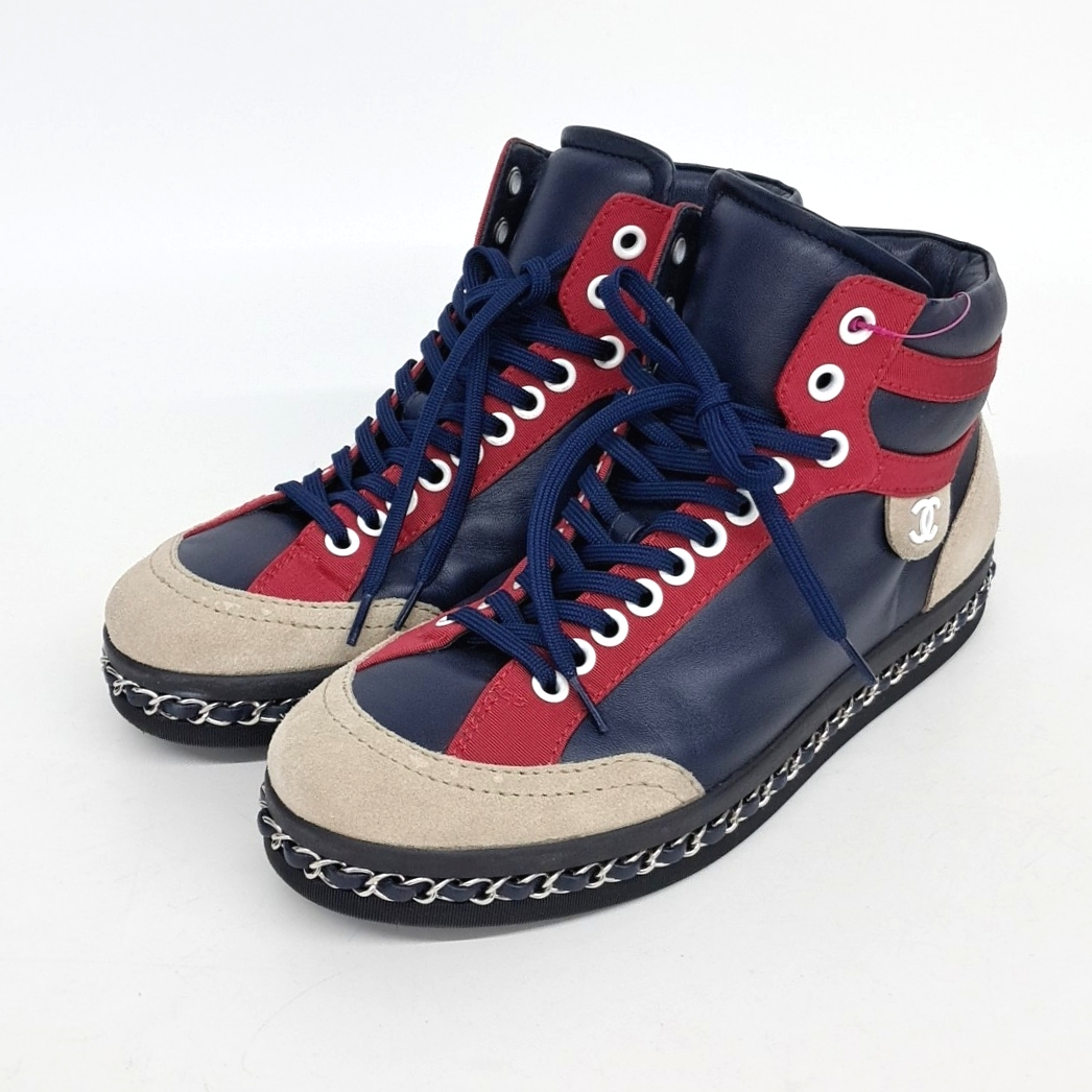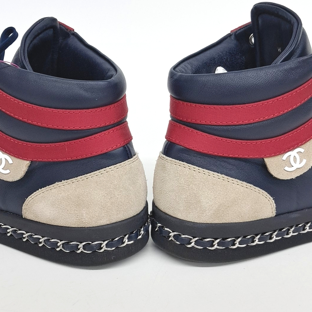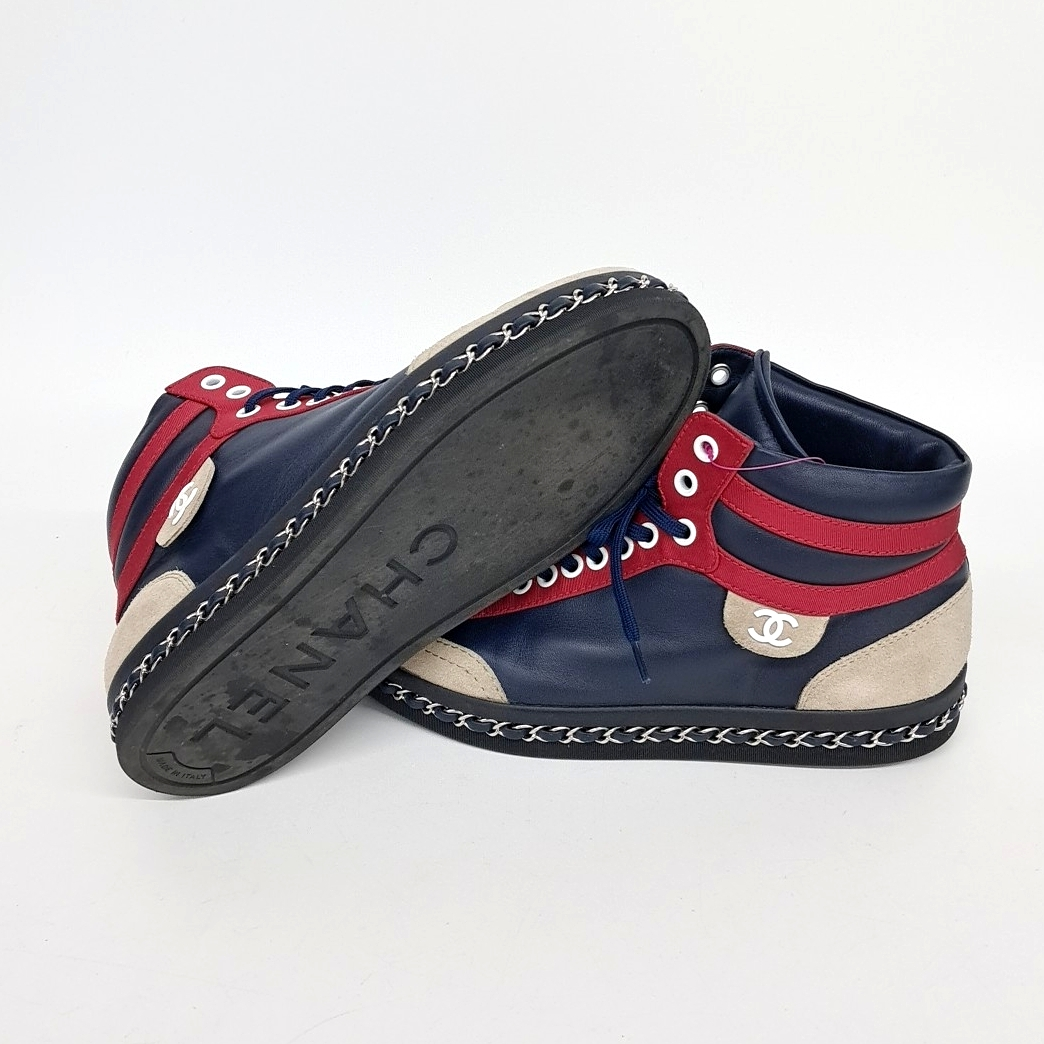 - Item Number: 10214134 - Korean Size: 240 - Gender: Women - Detailed Color: Navy Multi - Origin: Italy - Material: Multi-material - Size (Label): 37 - Heel Height: 2.5 cm (1.0 in) - Shoe Heel Height: 1~3 cm (0.4~1.2 in) - Season: All seasons - Gender: Men - Brand: CHANEL - Product Name: CHANEL High-Top Sneakers 117688 - Condition: A - trenbe Code: 117688 |