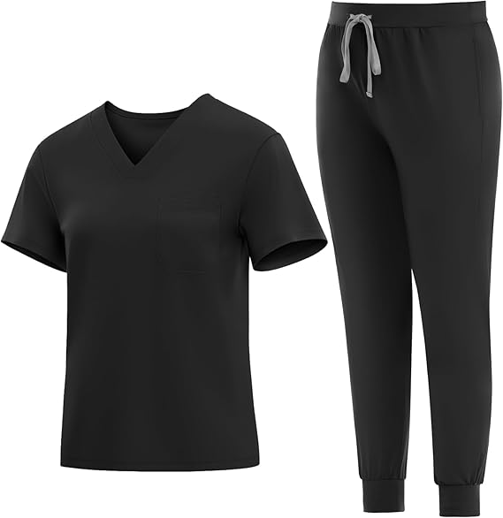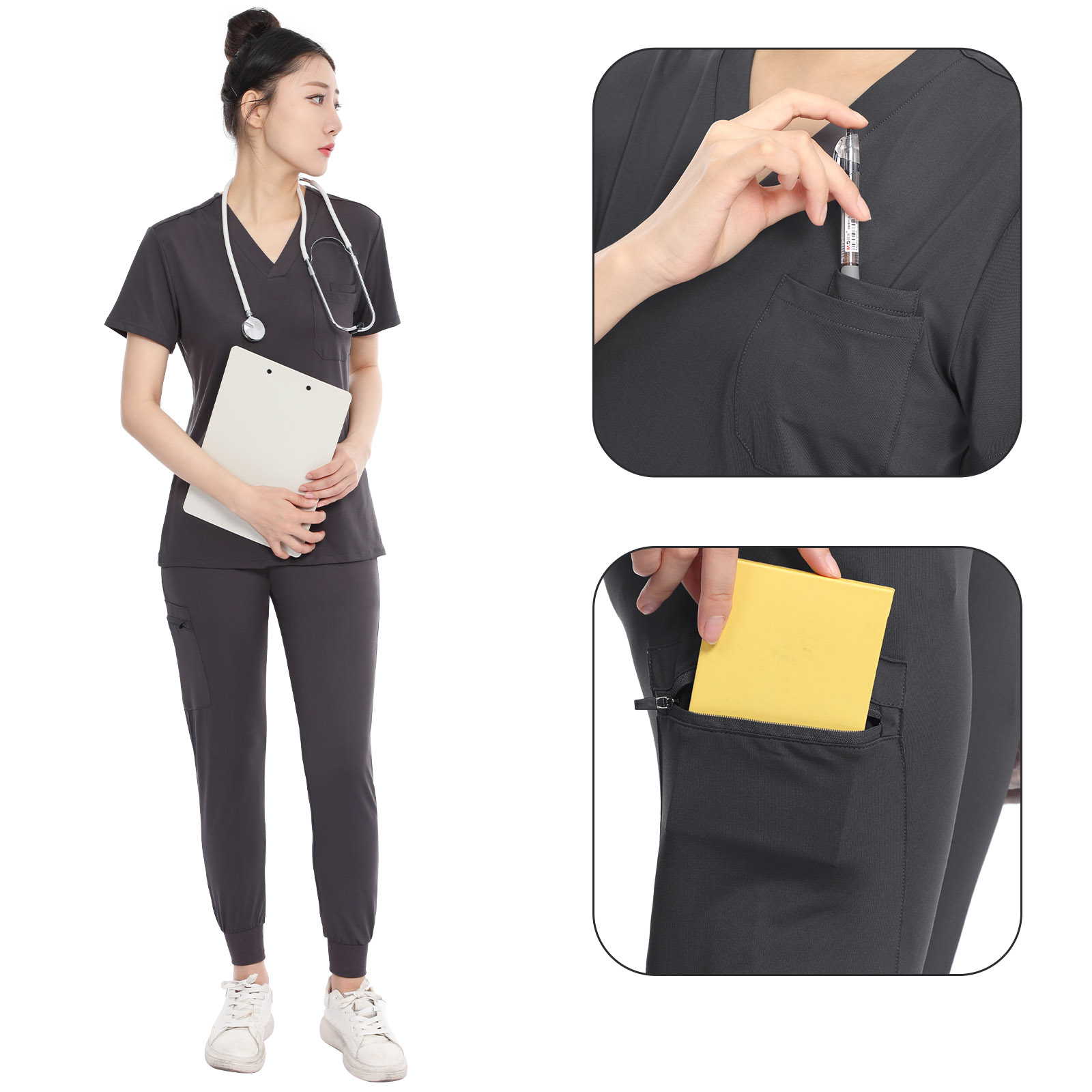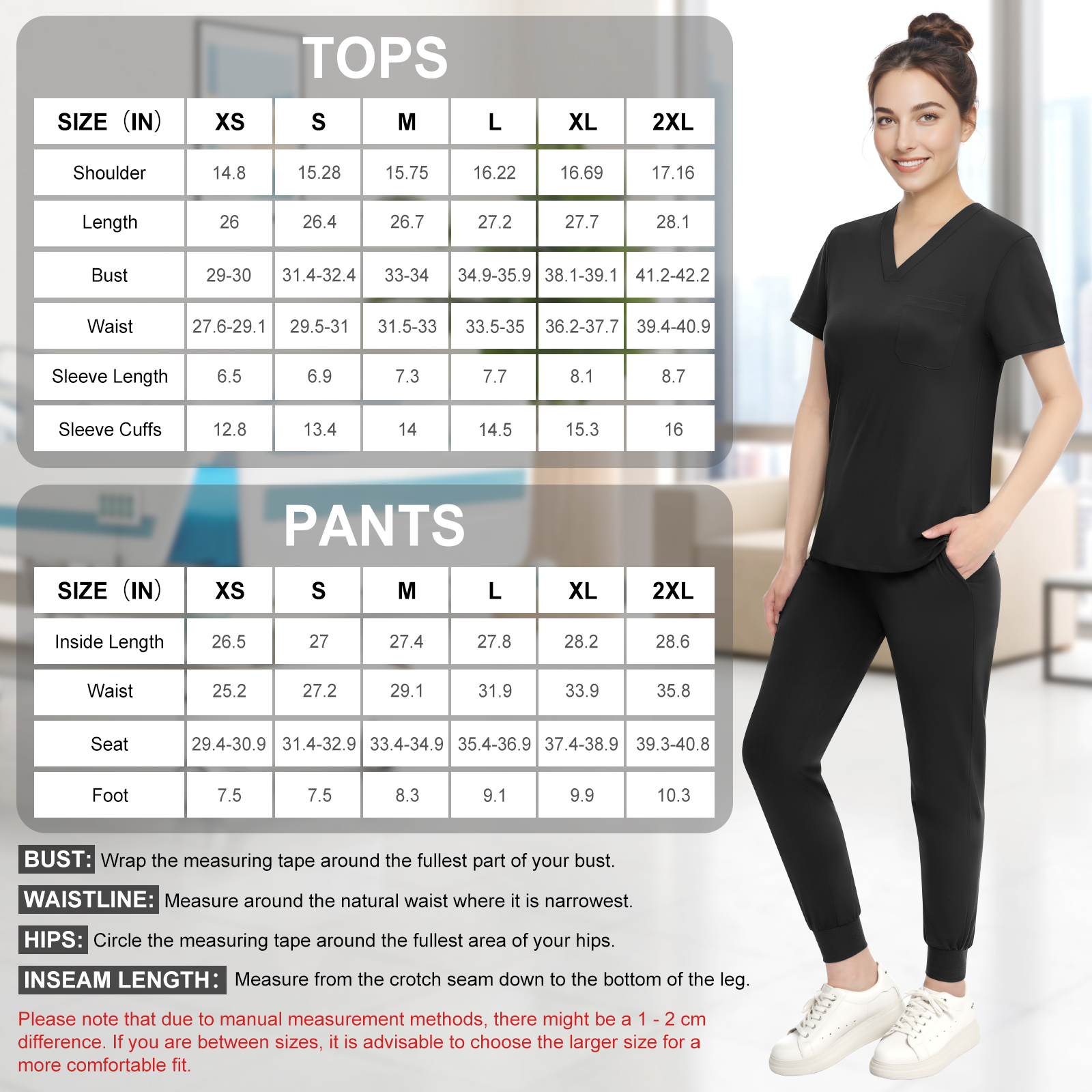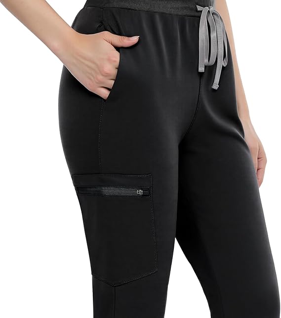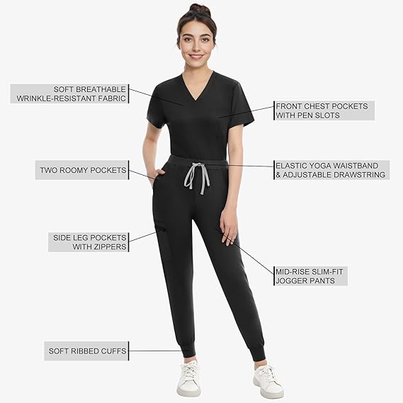 【Stylish & Functional】 Jogger scrubs for women sets with a sodern V-neck top and a yoga Jogger pants set, and it showcases the perfect combination of modern design and functionality. The scrubs top features one chest pocket, no tabs to ensure comfort. The pants feature a mid-waist skinny leg design, two deep trouser pockets and one side cargo poaket with zipper, a Lie Flat Ribbed Yoga Waistband & a Soft Stretch Outer Drawstring.
