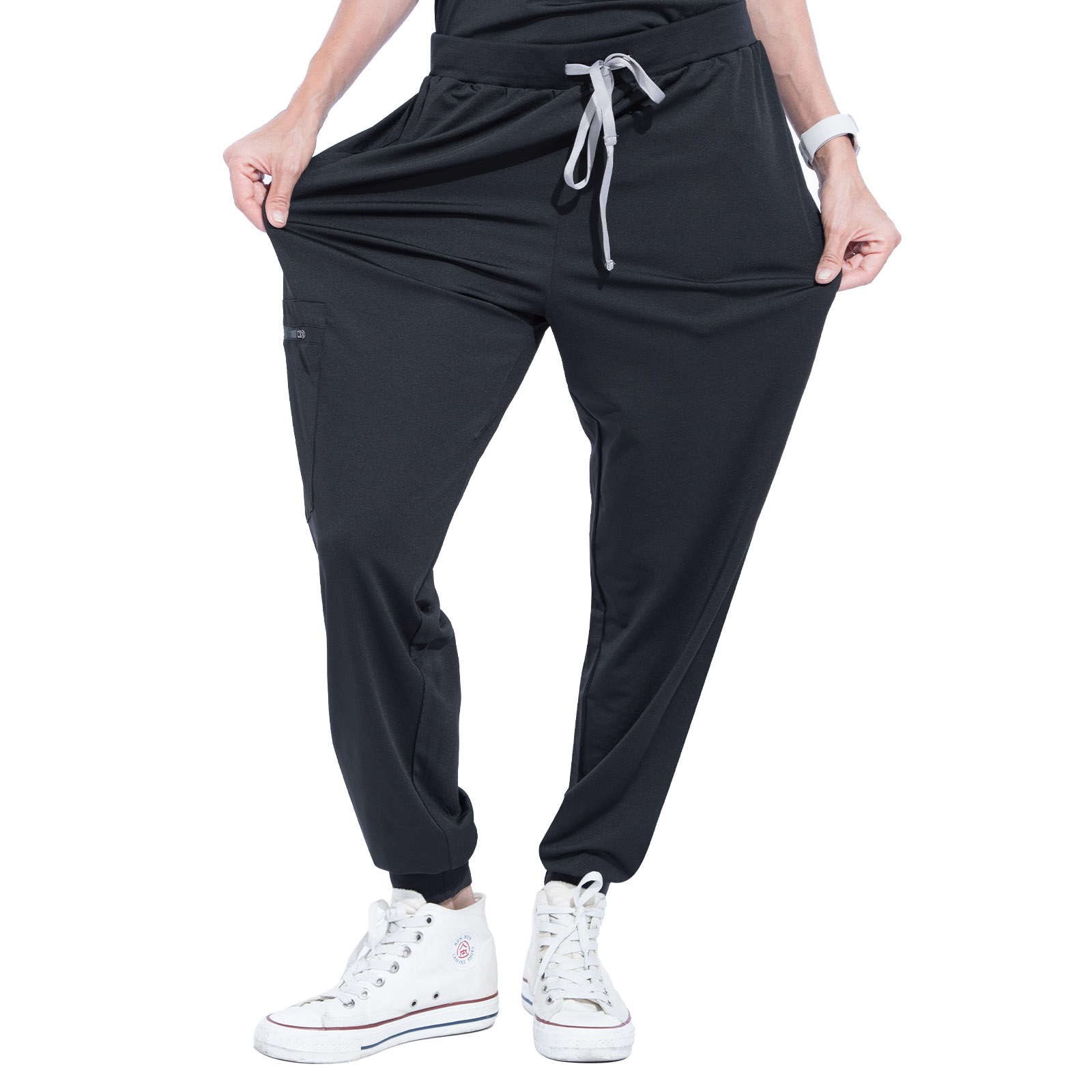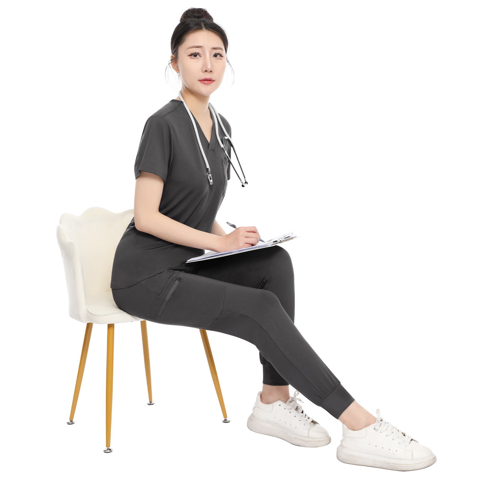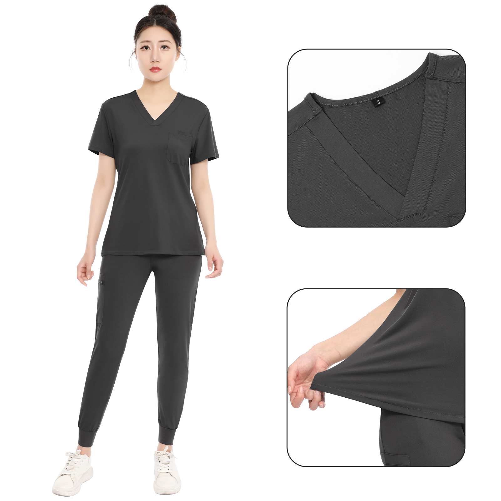 【Stylish & Functional】 Jogger scrubs for women sets with a sodern V-neck top and a yoga Jogger pants set, and it showcases the perfect combination of modern design and functionality. The scrubs top features one chest pocket, no tabs to ensure comfort. The pants feature a mid-waist skinny leg design, two deep trouser pockets and one side cargo poaket with zipper, a Lie Flat Ribbed Yoga Waistband & a Soft Stretch Outer Drawstring.