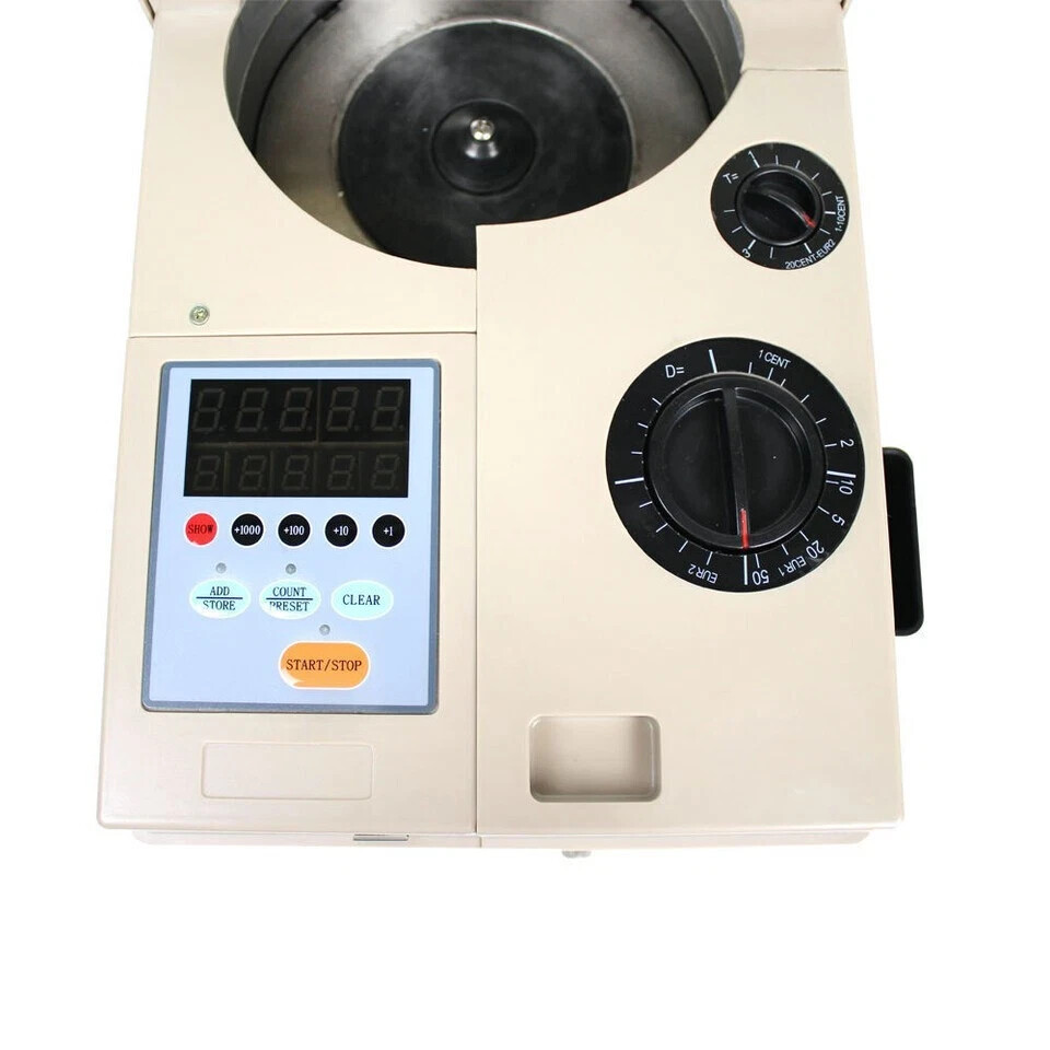 Coin counting machine is equipped with large capacity hopper bucket, according to outer diameter and the thickness of the coins or chips, to ensure that the coins or chips from the mechanical movement in specific centrifugation single currency were selected and counted by an adjustable track and the number of coins or chips can be preset respectively, storage and accumulation. The products are used in the financial system, public transportation, telecommunications, subway, entertainment and other businesses.