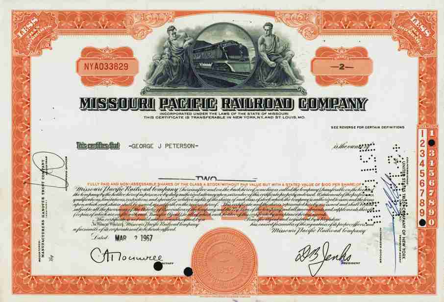 TOP Railroad - Aktie ## Originalaktie -- siehe Bild -- Einzelstück - der Missouri Pacific Railroad Company, Certificate über 2 Shares vom März 1967. Die Missouri Pacific Railroad war eine der ersten Eisenbahngesellschaften in den Vereinigten Staaten von Amerika westlich des Mississippi River. Am 4. Juli 1851 erfolgte in St. Louis, Missouri, der Spatenstich zum Bau der Pacific Railroad. Gleichzeitig war das auch der Beginn der Geschichte der Missouri Pacific Railroad. Der erste Streckenabschnitt wurde 1852 fertiggestellt, 1865 war die Pacific Railroad die erste Eisenbahngesellschaft, die Kansas City bediente, nachdem der Bau durch den Sezessionskrieg unterbrochen worden war. 1872 wurde die Pacific Railroad dann zur Missouri Pacific Railway umorganisiert. Von 1879 bis 1915 leitete Jay Gould, ein New Yorker Financier, die Gesellschaft. Unter seiner Leitung wurde das Streckennetz bis nach Colorado, Nebraska, Arkansas, Texas, und Louisiana ausgebaut. 1917 fusionierte die Gesellschaft mit der St. Louis, Iron Mountain and Southern Railway und wurde in Missouri Pacific Railroad umbenannt. Die Missouri Pacific war eine Class-1-Eisenbahngesellschaft, die aus etlichen Fusionen und Übernahmen gewachsen war. Einige der so integrierten Gesellschaften waren die St. Louis, Iron Mountain and Southern Railway, Texas and Pacific Railway, Chicago and Eastern Illinois Railroad, St. Louis, Brownsville and Mexico Railway, Kansas, Oklahoma and Gulf Railway, Midland Valley Railroad, Gulf Coast Lines, International-Great Northern Railroad, New Orleans, Texas and Mexico Railway, Missouri-Illinois Railroad und die kleine Central Branch Railway sowie Joint Ventures wie die Alton and Southern Railroad. In den 1980er Jahren besaß die Missouri Pacific 18458 Streckenkilometer in elf Bundesstaaten, über 1500 größtenteils moderne Diesellokomotiven und war ein Vorreiter im computerbasierten Bahnbetrieb. Sie war eines der wichtigsten Eisenbahnunternehmen für den Transport von Getreide, Kohle, Erz und Autos. 1982 unterhielt die Missouri Pacific mehr und modernere Lokomotiven und mehr Streckenkilometer als ihr Fusionspartner, die Union Pacific Railroad. Am 22. Dezember 1982 fusionierte die Missouri Pacific mit der Union Pacific und der Western Pacific Railroad zum Union Pacific System. Die Gesellschaft war zwar nun der Holding- Gesellschaft Union Pacific Cooperation unterstellt, behielt ihren Namen aber bis 1997 bei. US - Papier in normaler Erhaltung: VF. Sammlerfreundlicher Sonderpreis !