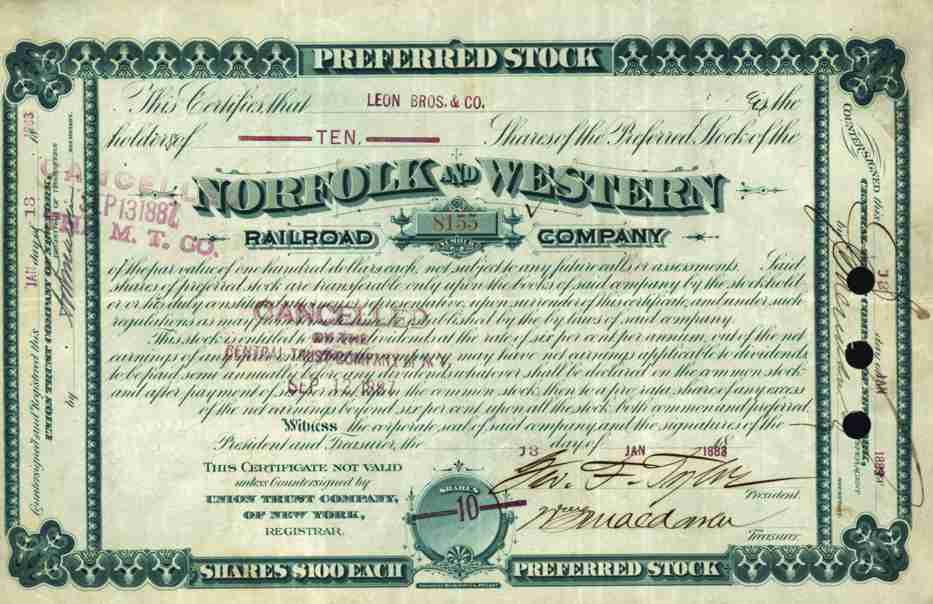 Noch heute aktiv --- nicht häufig angeboten !!! Eine der ÄLTESTEN Jahrgänge -- nur zwei Stück verfügbar !!! ### Orginalaktie -- siehe Bild -- Preferred Stock über10 shares vom 13. Januar 1888 der Norfolk & Western Railway, Virginia. Die Gesellschaft wurde bereits 1838 mit der 9 Meilen-Strecke von Petersburg nach City Point gegründet. Bis 1985 profitierte die Linie von über 200 Fusionen und bediente über 7000 Meilen in 14 Staaten. Die Hauptstrecke war Norfolk, Virgina nach Briston, Tennessee (412 Meilen). William Mahone, ein Ingenieur des Virginia Military Institute, der die Norfolk and Petersburg Railroad plante und später leitete verfolgte einen eigenen Plan: Einige Linien wurden zusammengeführt und formten die Atlantic, Mississippi & Ohio RR. Doch diese Linie geriet 1881 in Schwierigkeiten und die Privat Bank E.W. Clark & Co. aus Philadelphia übernahm sie und führte wieder den alten Namen Norfolk & Western ein. Frederick J. Kimball wurde um 1881 zum Präsidenten ernannt. Er stellte die Weichen für eine erfolgreiche Zukunft. So überstand die Gesellschaft zwei Weltkriege und erwarb zwischen 1959 und 1964 folgende Bahnen:-Virginian Railway-Wabash RR- Nickel Plate RWy-Pittsburgh & West Virginia-Akron, Canton & Youngstown. 1982 wurde die Gesellschaft mit der Southern Railway fusioniert und firmierte heute unter dem Namen Norfolk Southern Corporation. Orginalunterschriften u.a. vom Präsidenten Frederick J. Kimball !! US - Papier in normaler Erhaltung: VF. !! Sammlerfreundlicher Sonderpreis !