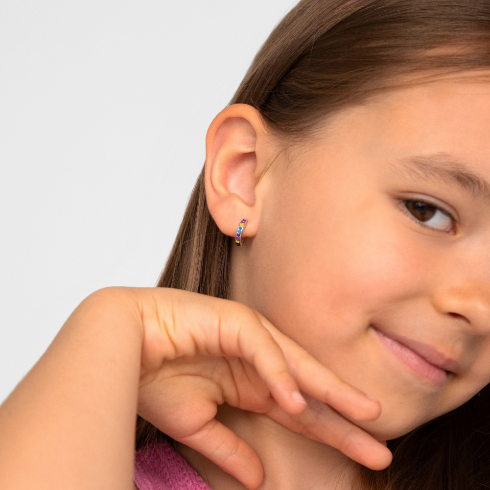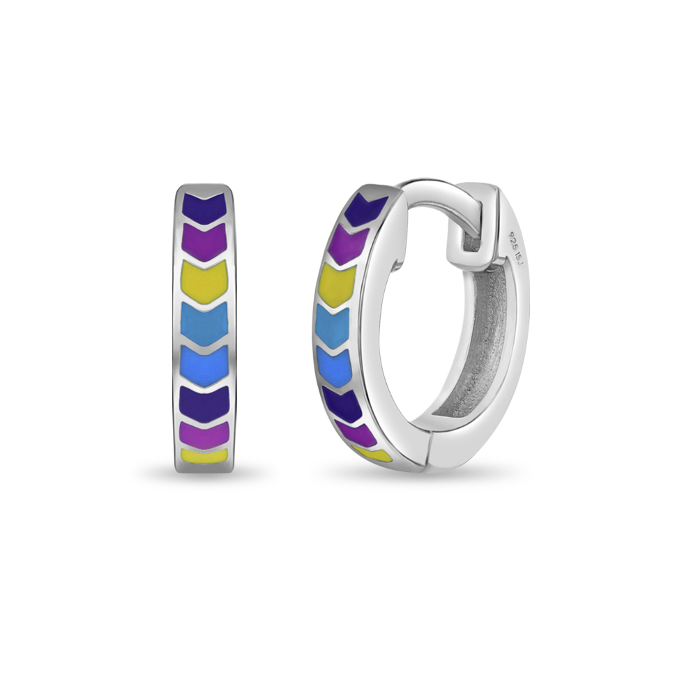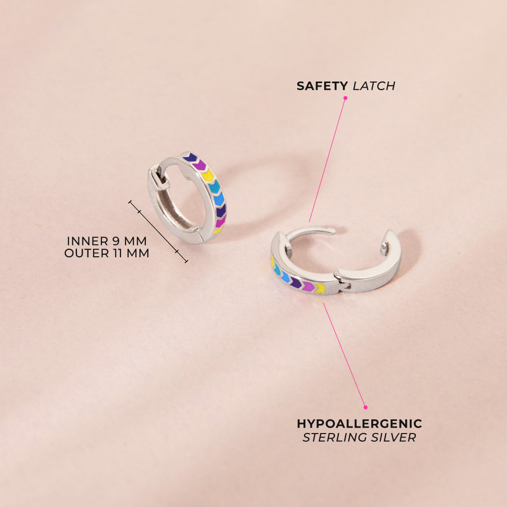Add a playful pop of color to her look with these charming little girls' hoop earrings, featuring a multicolored chevron pattern in soft rainbow pastel hues. Crafted entirely from 925 sterling silver, these hoops are both durable and gentle on young ears. The secure hinged closure makes them easy to put on and take off, while ensuring a comfortable fit she can wear all day. For adding a cheerful touch to any outfit! A small gift box is included with purchase.