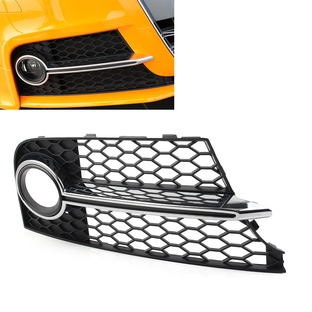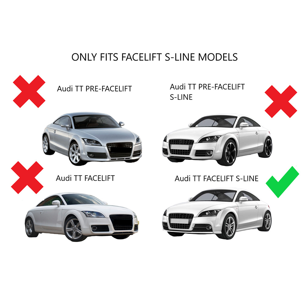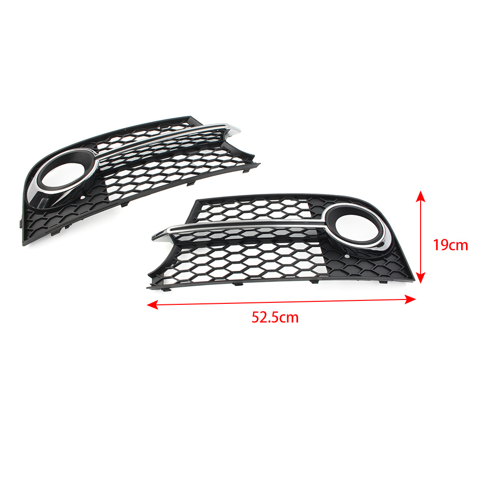 Front Bumper Honeycomb Mesh Fog Light Grille Cover For Audi TT MK2 TTS 2011-2014 Specifications: Condition: 100% Brand New Material: Plastic Color: Black + Chrome Placement on Vehicle: Front, Left, Right Fitment Type: Direct Replacement Manufacturer Part Number: 8J0807681K/8J0807682K Size(L*W): 52.5x19 cm Fitment: Fit for Audi TT MK2 TTS 2011-2014 ONLY FIT FOR FACELIFT BUMPER MODELS Please check whether this item can fit on your car before purchasing. Features: 1. The unique and fashionable design adds a luxurious and domineering appearance to your car. 2. Made of high quality plastic material, weather resistant, anti scratch, dustproof, sturdy and durable. 3. Strict quality control standards to Build and test. 4. The installation is simple, no complicated operation is required, convenient for using, save your effort. Package Include: 1 Pcs Front Fog Light Grille Notes: 1. No installation instruction included, professional installation is highly recommended. 2. Color may vary slightly due to the color setting of each individual monitor. 3. Please allow 1-3CM differs due to manual measurement.