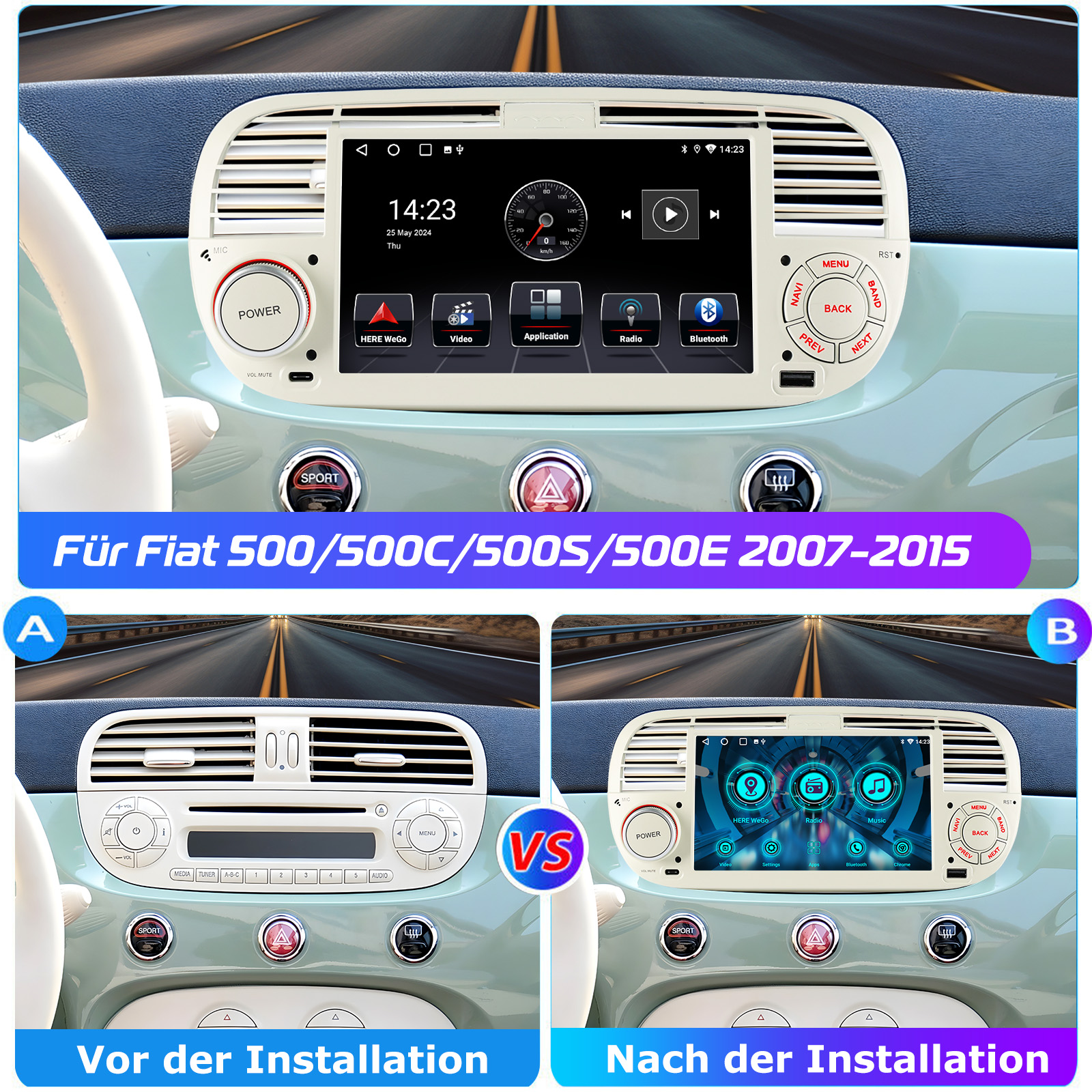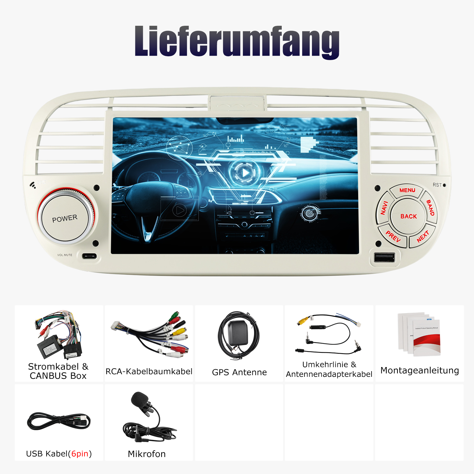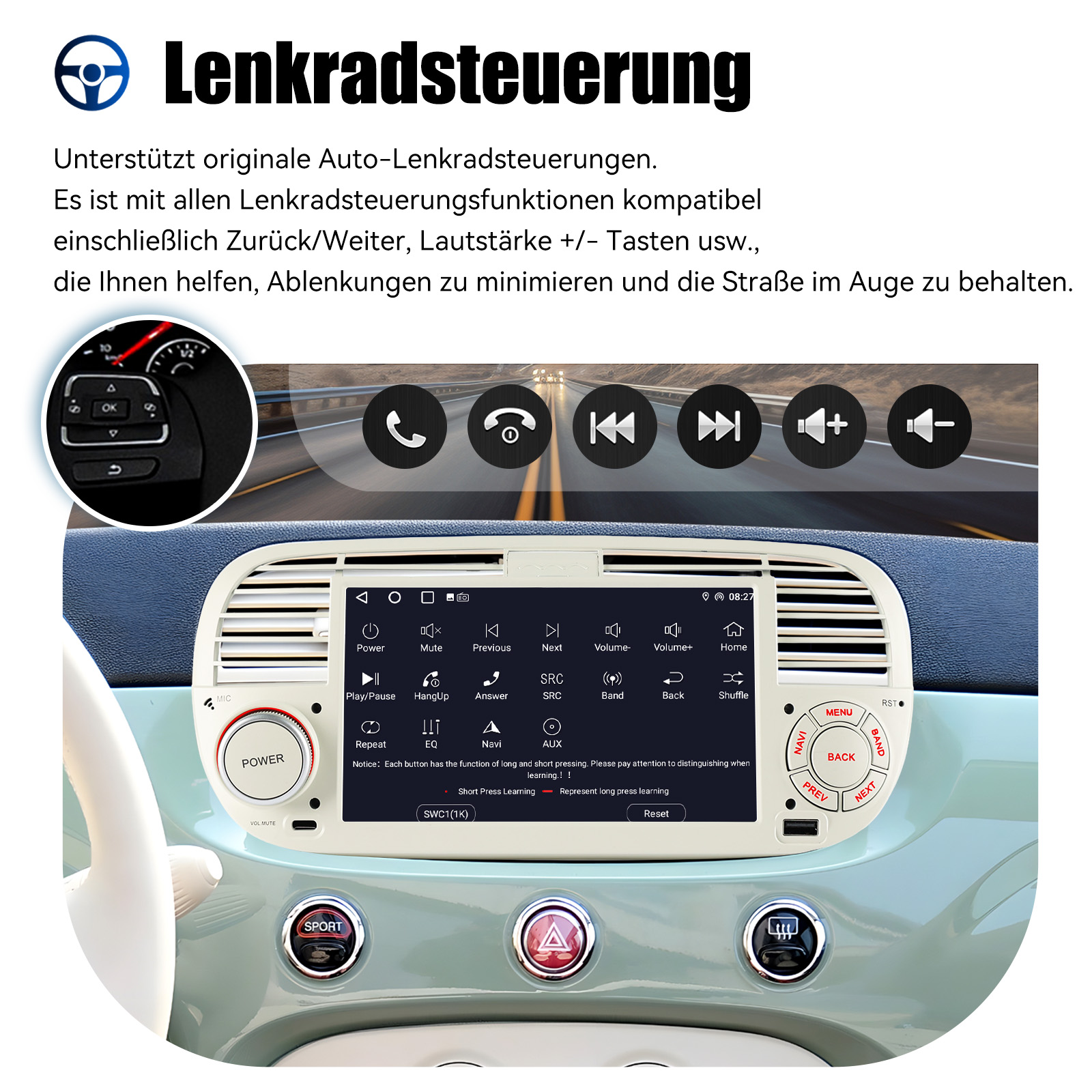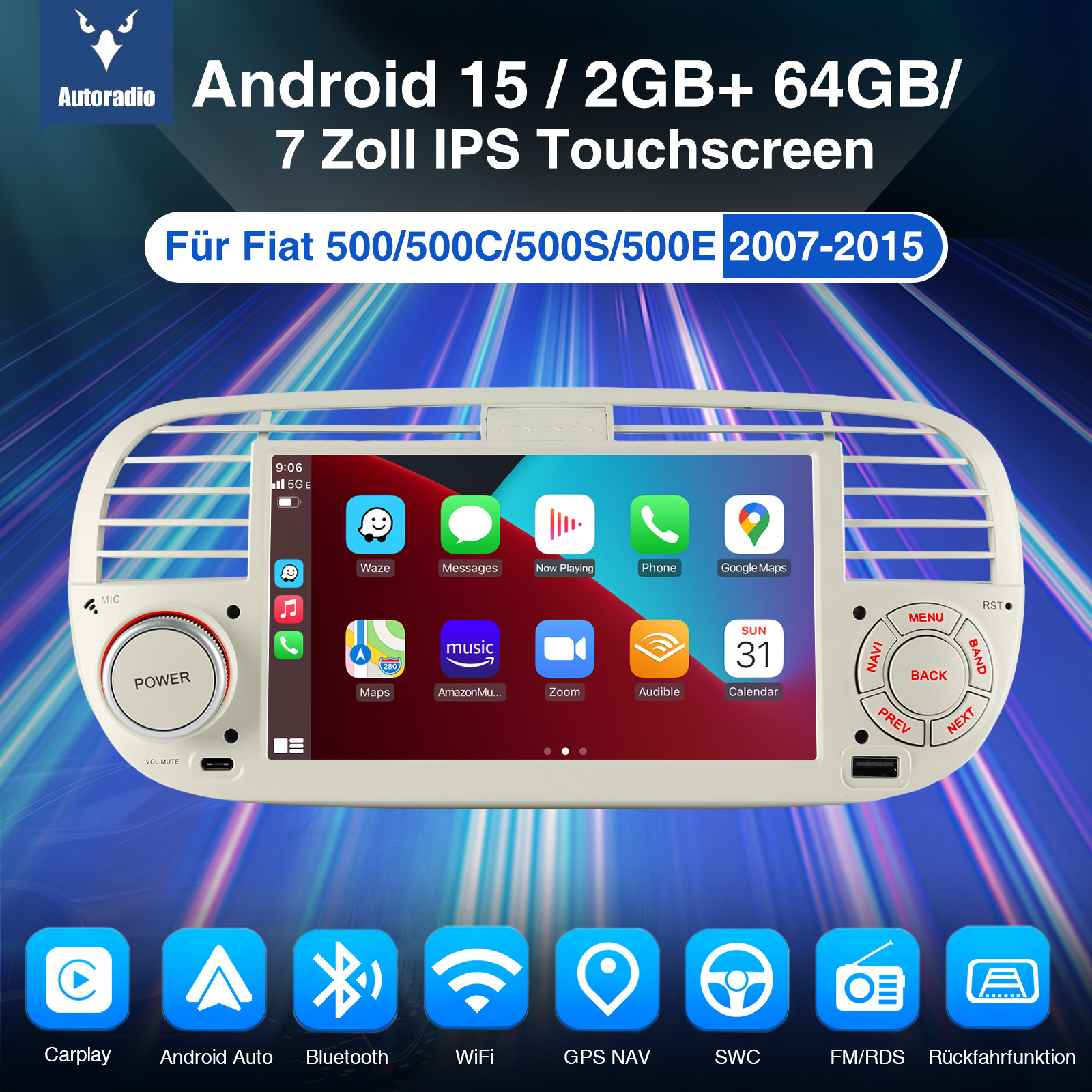 7 Zoll Android 15 Autoradio für FIAT 500: Dieses Radio ist geeignet für FIAT 500 2007-2015. Das Android Autoradio mit 7" 1024* 600 HD kapazitivem Touchscreen, 2GB RAM und 64GB ROM ermöglicht das Herunterladen Ihrer Lieblings-Apps und -Videos, damit das Autofahren nicht mehr langweilig wird. Kein zusätzlicher Rahmen, kein Kabelwechsel, Plug and Play. Es wird mit Canbus geliefert und unterstützt die meisten Originalfunktionen: Lenkradsteuerung, Rückwärtssignale und Lesen von Original-Computerdaten usw.
