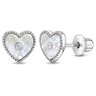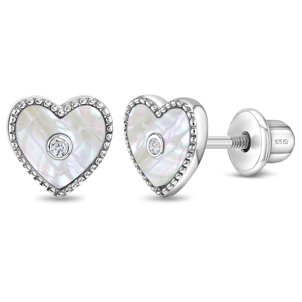 These charming heart-shaped kids' earrings feature a stunning simulated mother of pearl inlay, delicately accented by a small, sparkling clear cubic zirconia stone at the center. Crafted from 925 sterling silver, these earrings are hypoallergenic, making them ideal for children with sensitive ears. For added security and comfort, they come with a safety screw back closure, ensuring they stay securely in place during all of your child's adventures. A sweet heart shaped earring for a young girl to be able to add to her growing jewelry collection. A gift box is included with purchase.