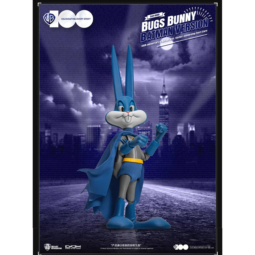 Included Accessories: Bugs Bunny in action figure form. Includes around 16 points of articulation. Three (3) pairs of replaceable hands. Cape made of real fabric. 100th anniversary of Warner Bros. Studios limited edition Bugs Bunny as The Batman.