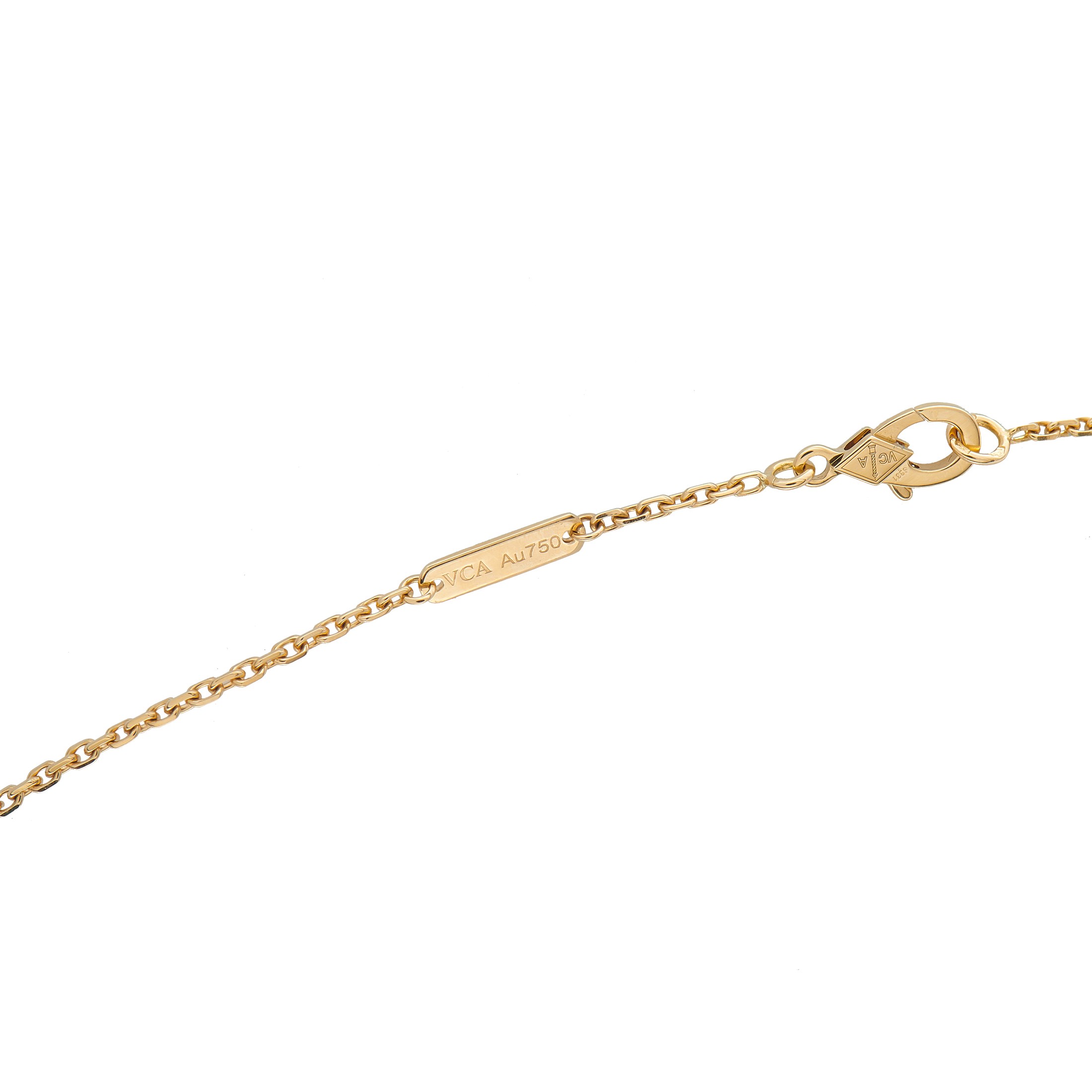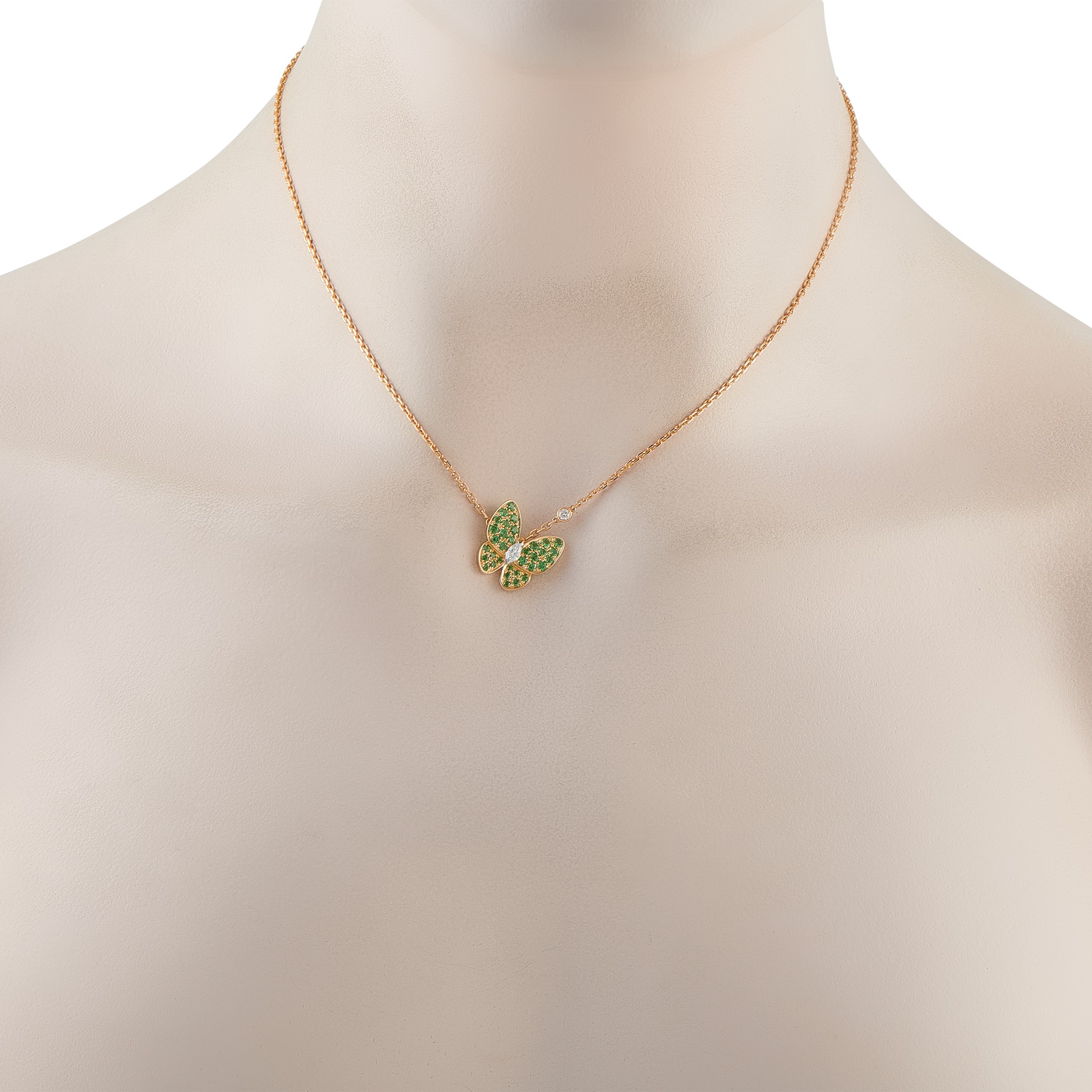 An asymmetrical design makes this Van Cleef & Arpels Two Butterfly necklace resemble a graceful butterfly in flight. Inset Sapphires add a splash of color to this charming piece. A marquise Diamond at the center and a round-cut Diamond on the chain provide this piece with even more elegance. Crafted from 18K Yellow Gold, the pendant measures 0.69 long by 0.63 wide and is suspended at the center of a 16 chain.This jewelry piece is offered in estate condition and includes a the manufacturer's papers.