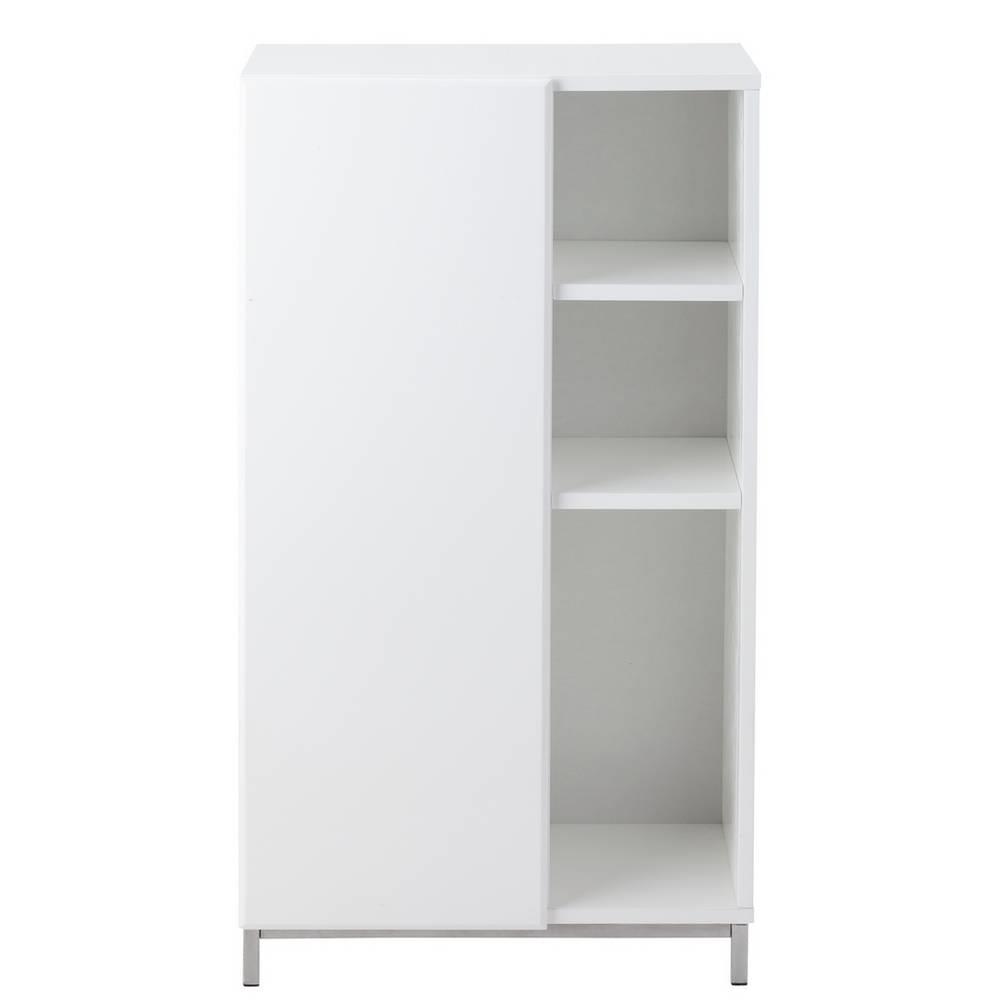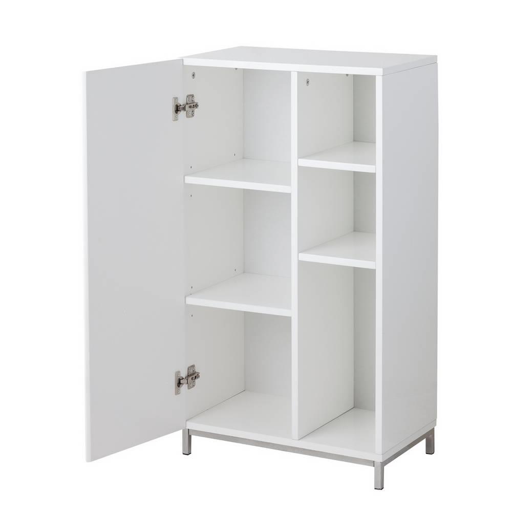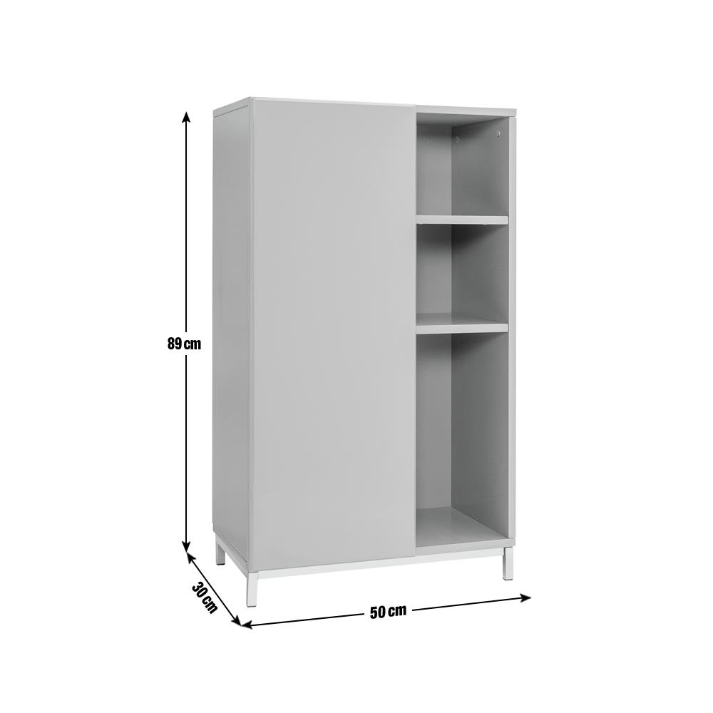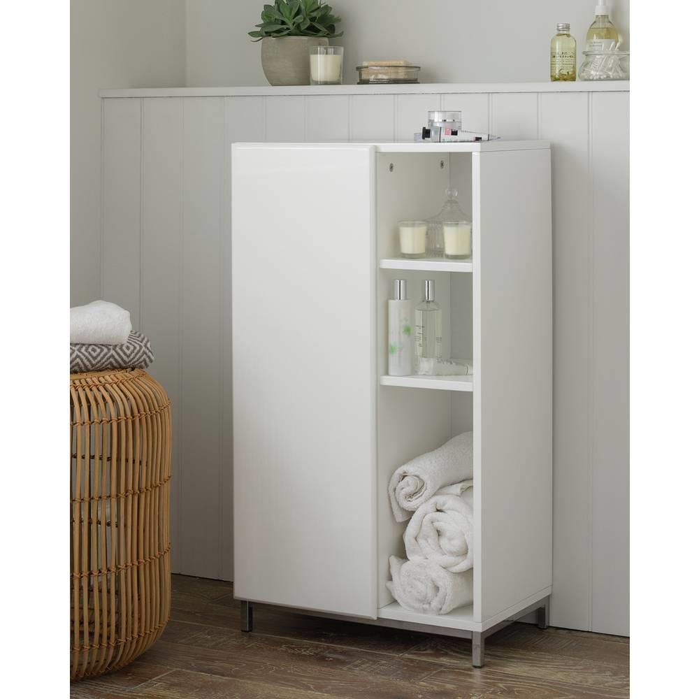 This freestanding gloss bathroom cabinet combines modern design with practical storage. The open shelving is ideal for frequently used items, while the cupboard section provides concealed storage for cleaning products and toiletries.