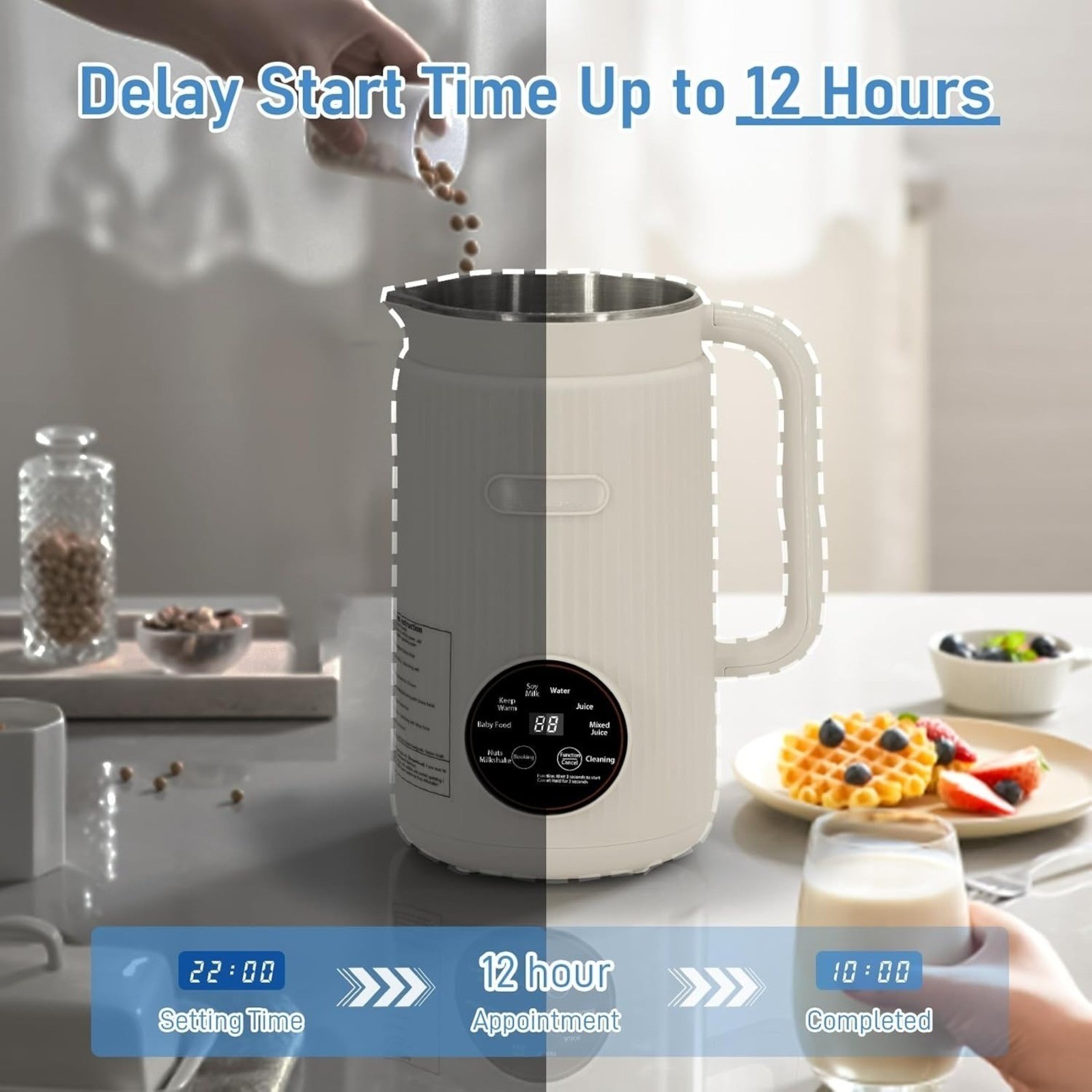 2H Keep Warm & 12H Delay Start: Maintains optimal temperature for up to 2 hours to preserve nutrients. The 12-hour delay start lets you wake up to ready-to-drink almond, oat, soy, or coconut milk.