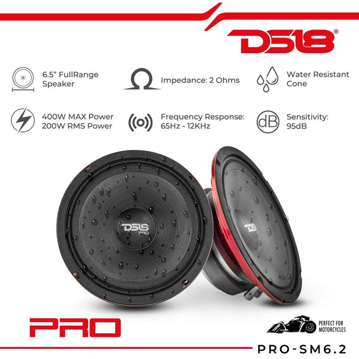 DS18 created the PRO-SM6.2 to fill a void in the audio market, a motorcycle speaker that will stand up to any weather you drive through and continue to sound great. DS18 developed these midrange speakers to work with standard OEM motorcycle amplifiers and radios, combine that with their slim profile and these will work well with most motorcycles on the road today. These speakers feature IP66 protection so it can handle the rain and spray from the road just fine. Take your motorcycle's audio to the next level with these water-resistant midrange speakers from DS18.