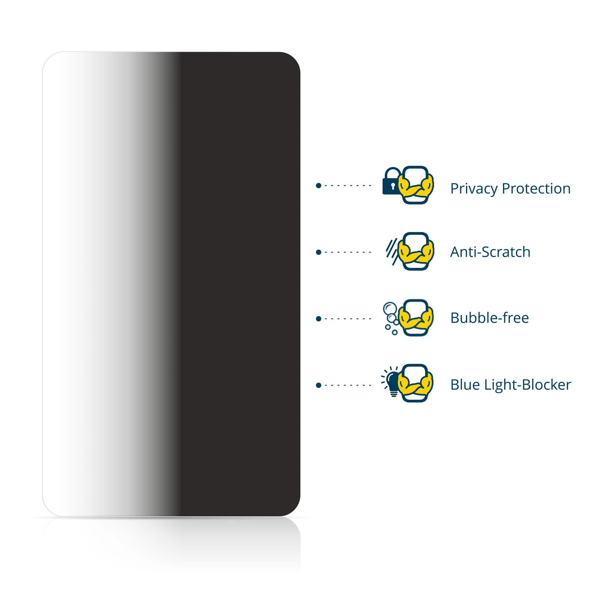 The newly developed silicone adhesive layer allows an easy and bubble-free application in a few seconds. The privacy screen protector can be removed effortlessly without leaving any residues.