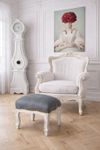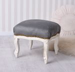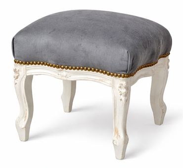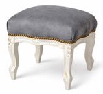 Das Fußbänkchen „Chateau Monfort“ in Creme-Weiß mit grauem Polsterbezug ist ein elegantes Barockmöbel, das klassische Formensprache mit moderner Zurückhaltung verbindet.