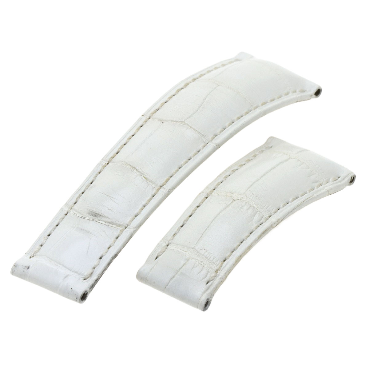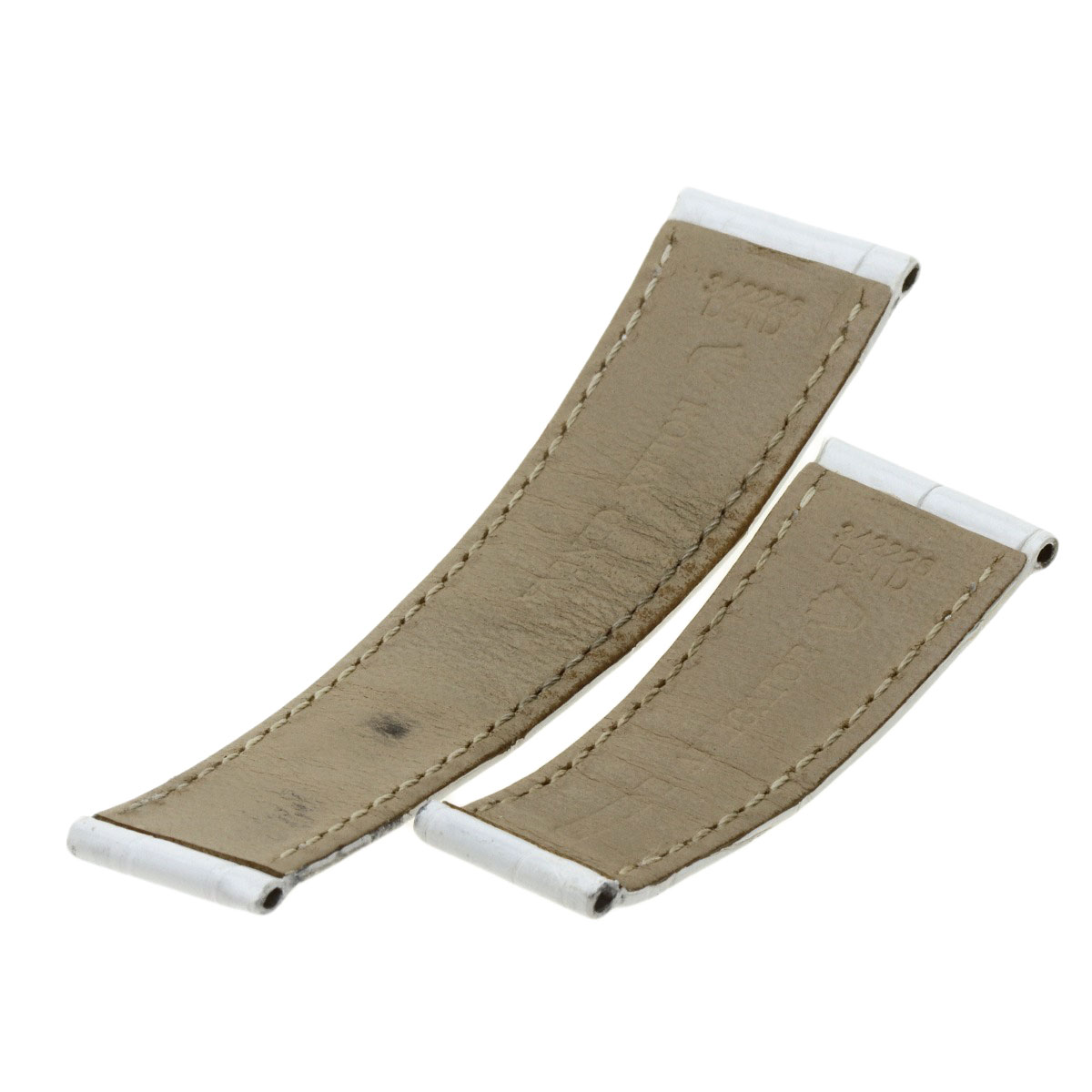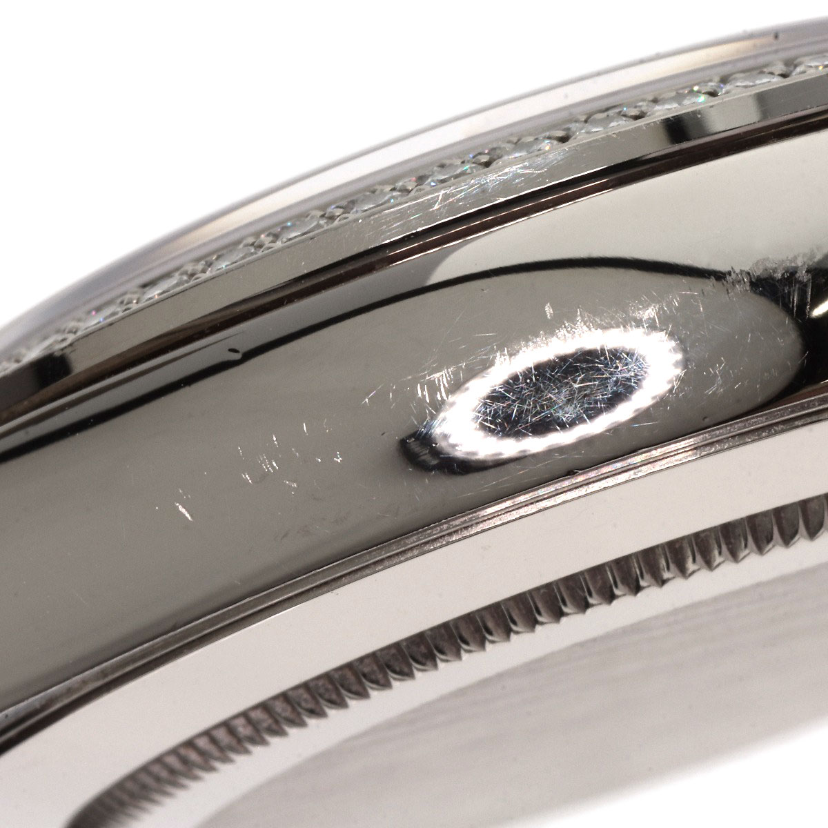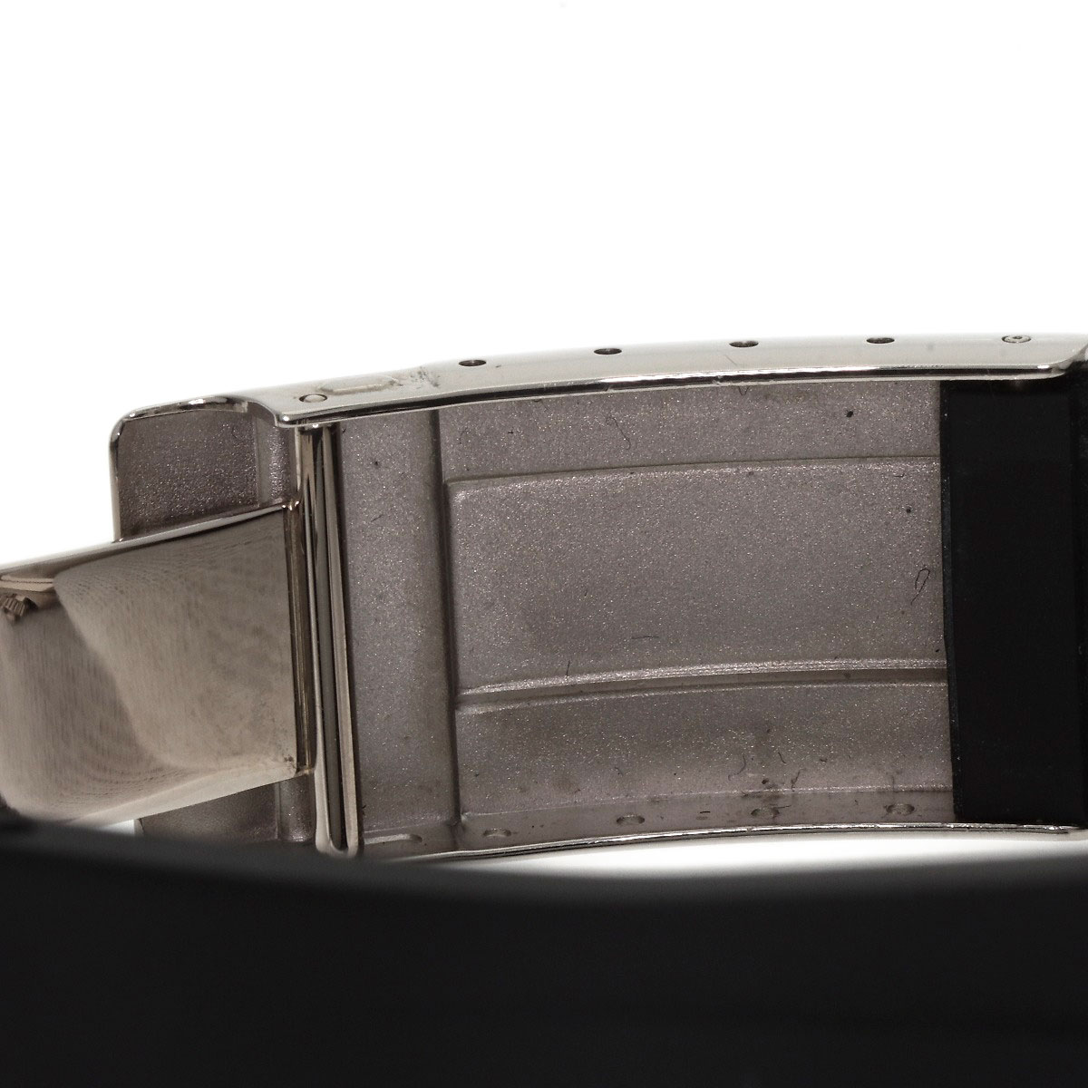 The belt is an aftermarket product. There are slight chips on the edge of the glass at 2 o'clock and 11 o'clock.