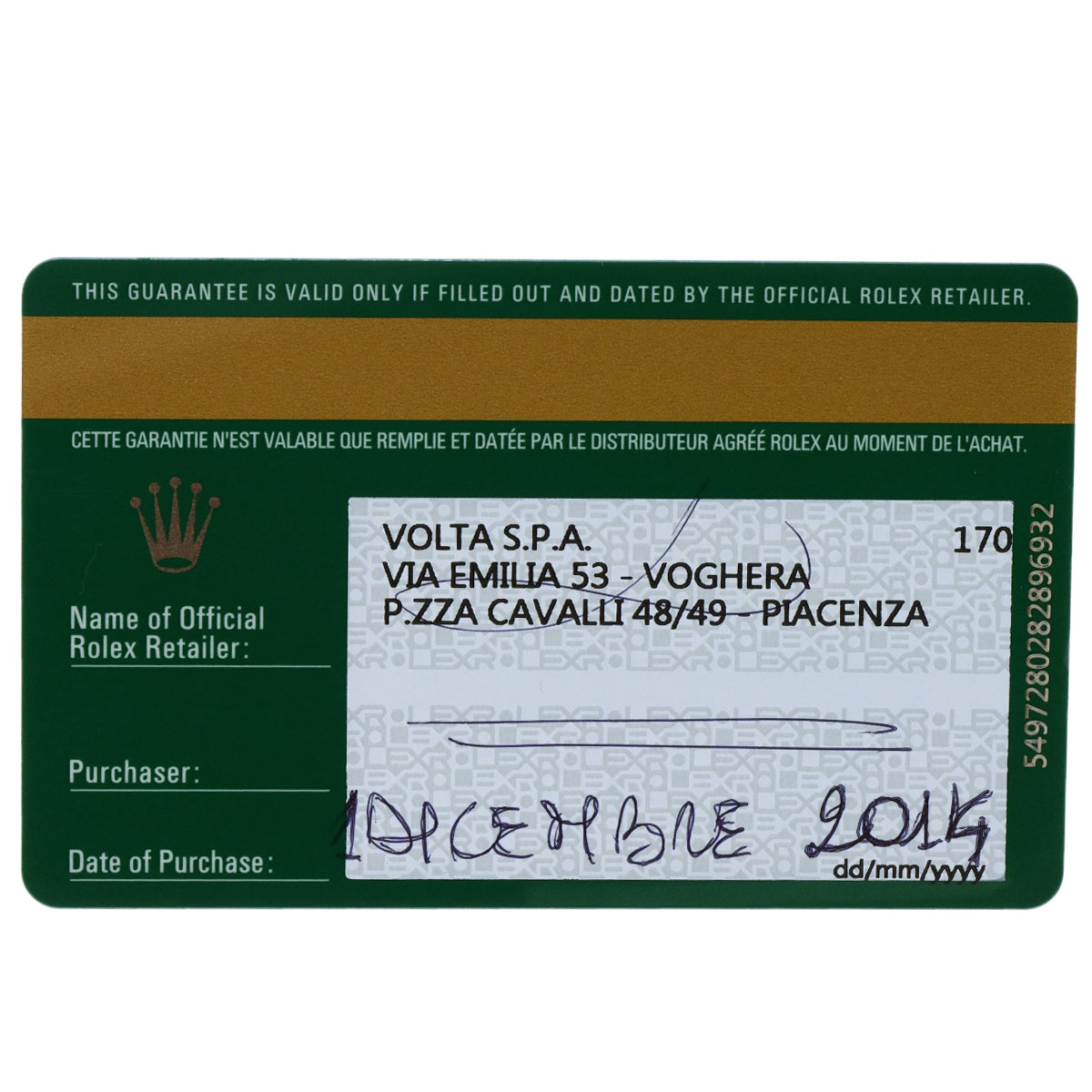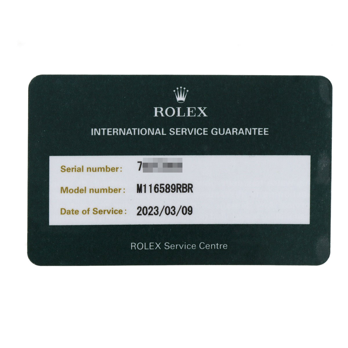 | Accessories | Rolex card, international service warranty, box, replacement belt |