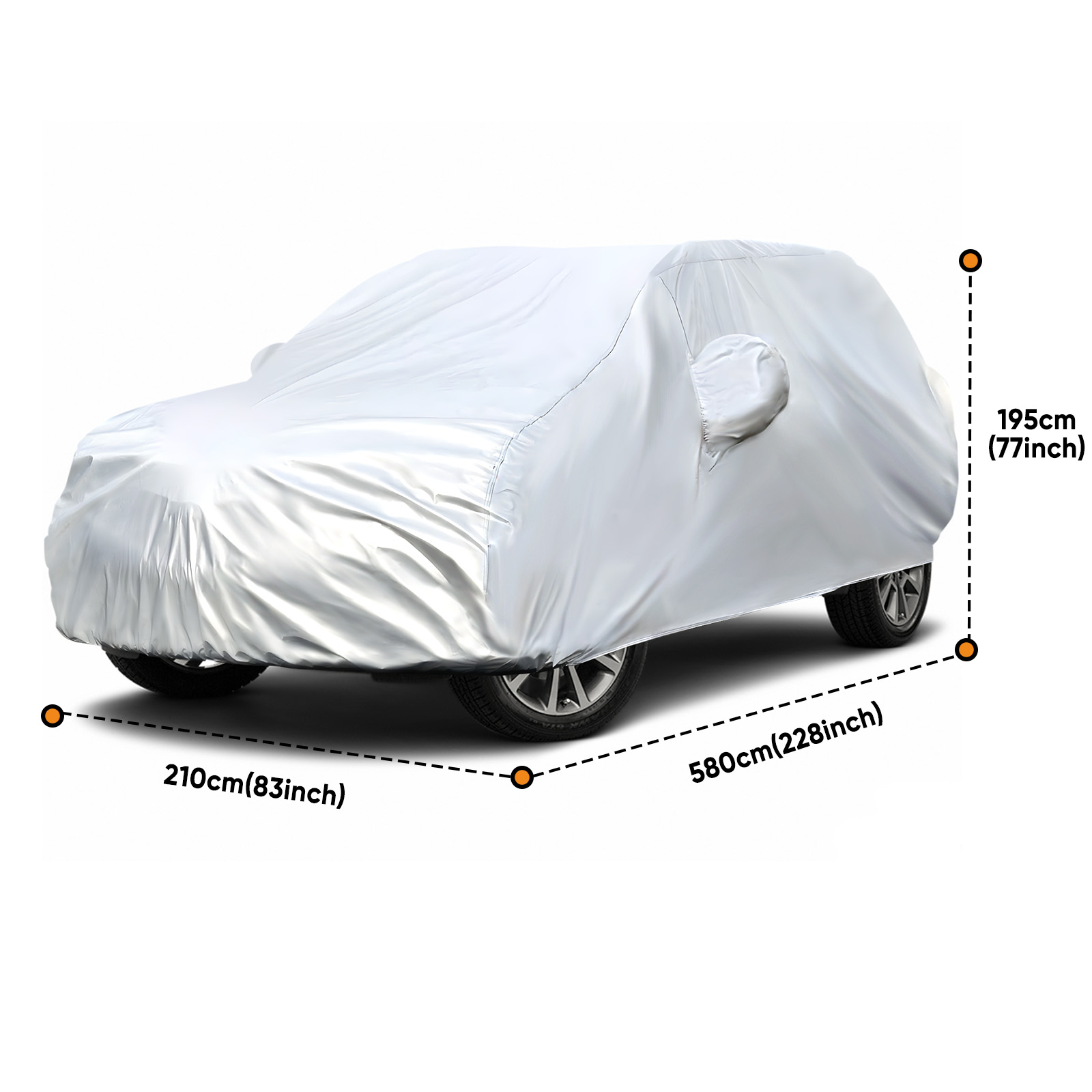 【Universal Fit for SUV】---Car Cover Size XXXL: 580 x 210 x 195cm / 228"L x 83"W x 77"H. M-XXXL Car cover SIZE fit most SUV. Please Measure Your Car's Length First.