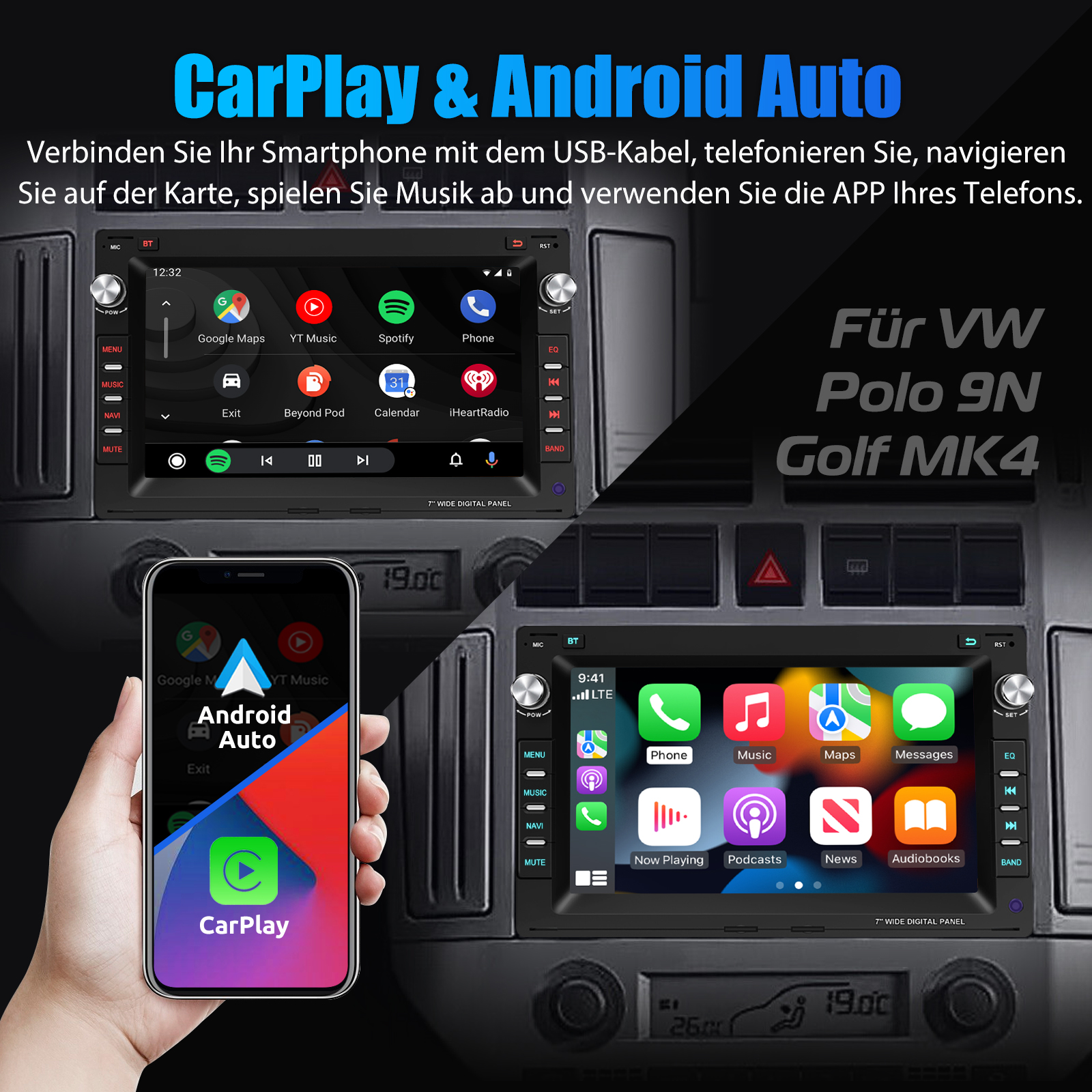 7 Zoll Android 15 Autoradio Für VW Polo 9N Golf Jetta MK4 Passat B5: Das Android Autoradio mit 7" 1024* 600 HD kapazitivem Touchscreen, 2GB RAM und 64GB ROM ermöglicht das Herunterladen Ihrer Lieblings-Apps und -Videos, damit das Autofahren nicht mehr langweilig wird. Kein zusätzlicher Rahmen, kein Kabelwechsel, Plug and Play. Es wird mit Canbus geliefert und unterstützt die meisten Originalfunktionen: Lenkradsteuerung, Rückwärtssignale und Lesen von Original-Computerdaten usw.