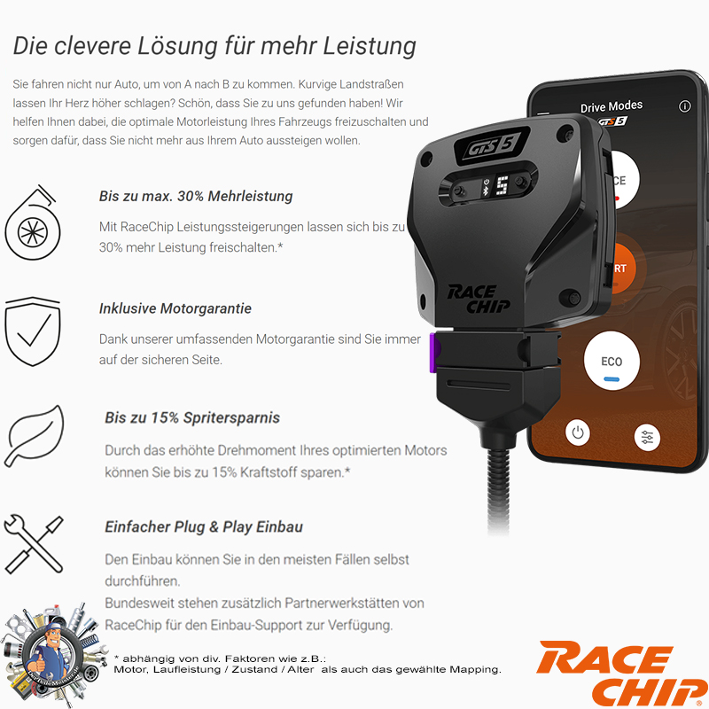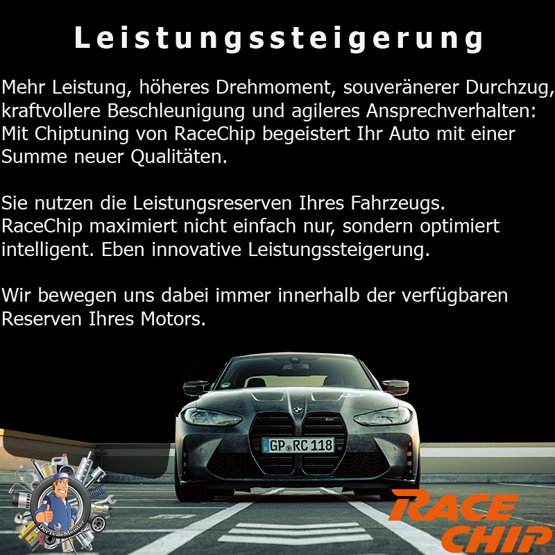 - RaceChip sowie der Verkäufer geben keine Garantie auf Motor-, Getriebe- und Steuergerätschäden. Jegliche Garantie auf andere beanspruchte Teile entfällt ebenfalls.