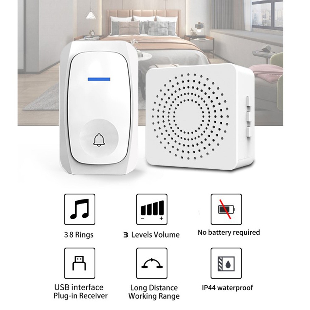 Caractéristiques : * Alimentation auto-générée : la sonnette sans fil est alimentée par une source d'alimentation auto-générée, éliminant ainsi le besoin pour batteries ou alimentation externe. * Configuration facile du bouton : appuyez sur le bouton pour configurer la sonnette, pour ce qui rend le processus de configuration rapide et sans tracas. * Étanche et anti-poussière : l'émetteur est conçu sans mandrin à , des performances étanches et anti-poussière, pour ce qui le rend approprié pour l'extérieur use. * Large distance de réception : avec une distance de réception de 150 M dans les zones ouvertes, la sonnette fournit une réception fiable du signal, même à distance. * Polyvalent et personnalisable : la sonnette offre 60 sonneries au choix, et peut être ajustée à 5 niveaux de volume différents ou en sourdine. Il convient pour use dans les maisons, les bureaux, les villas, les hôpitaux, les écoles et les usines.