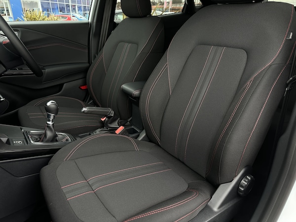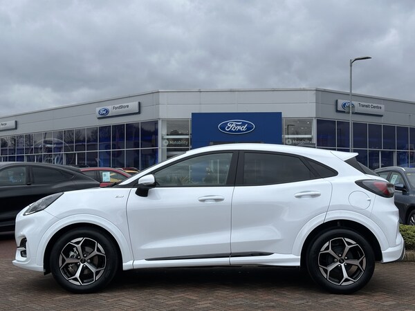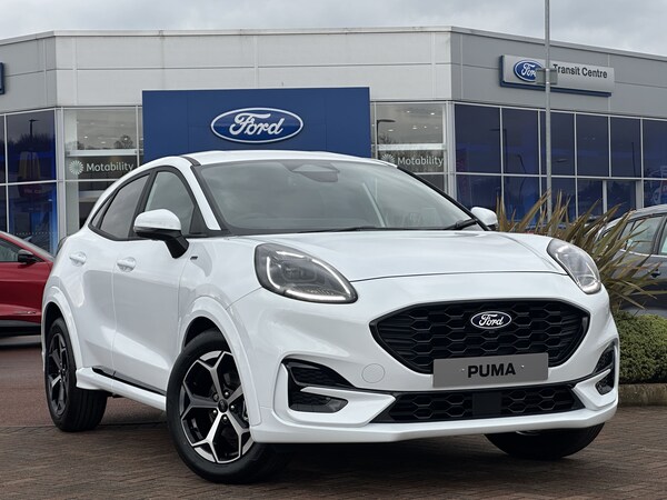 Take a Test Drive before 28th February to access this offer! (T&Cs apply). Ford Puma ST-Line pairs sporty styling with everyday smart features. It adds a unique body styling kit, 17 alloy wheels, sports-tuned suspension and a flat-bottom steering wheel with red stitching for a dynamic look and feel. Inside, you get a full digital 12.8 instrument cluster and Fords 12"" SYNC touchscreen with Apple CarPlay and Android Auto, and driver assistance tech such as cruise control with intelligent speed assist, lane-keeping aid, and rear view camera with parking sensors. Practical touches include power-folding heated mirrors, rear privacy glass and the Pumas clever extra-deep waterproof MegaBox boot storage. Finally Fords unique Quickclear heated winsdcreen is fabulous to enable a quick deparature on a cold winter da