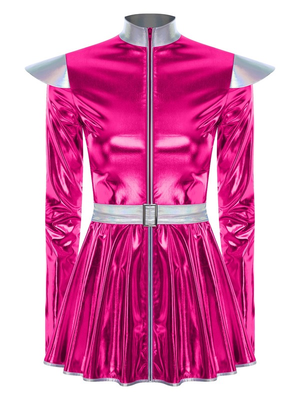 The metallic shiny finish gives the dress a futuristic and eye-catching look, in line with the latest fashion trends and making the wearer stand out.