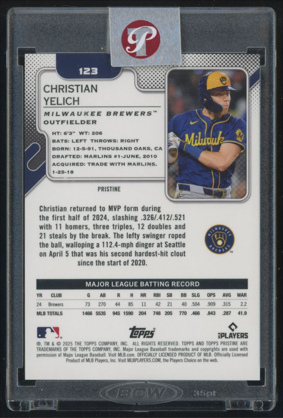 | 2025 Topps Pristine Christian Yelich /10 Milwaukee Brewers #123 Pristine |
