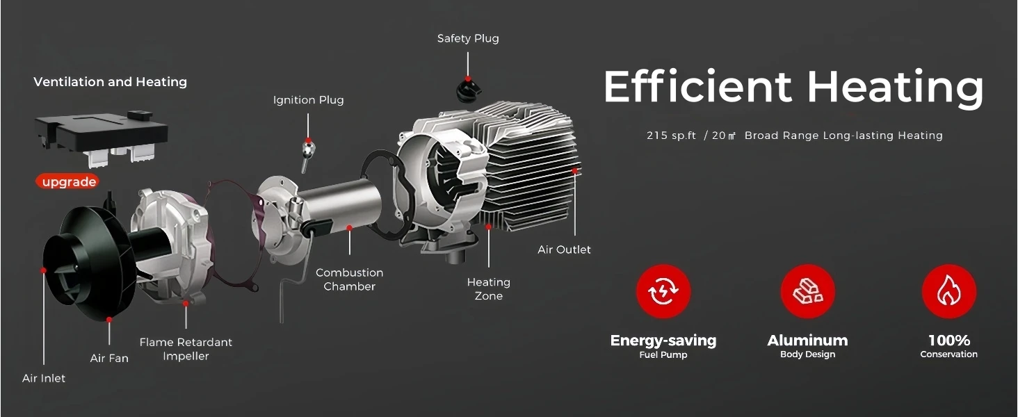 Our diesel heater has a power of 8kw with a heating efficiency of ≥90%. It consumes only 1 GAL of diesel per night (with low fuel consumption of 0.16-0.45 (L/H)。Besides, the fuel pump's injection frequency and intake air amount are accurately controlled by ECU to extend the service life.