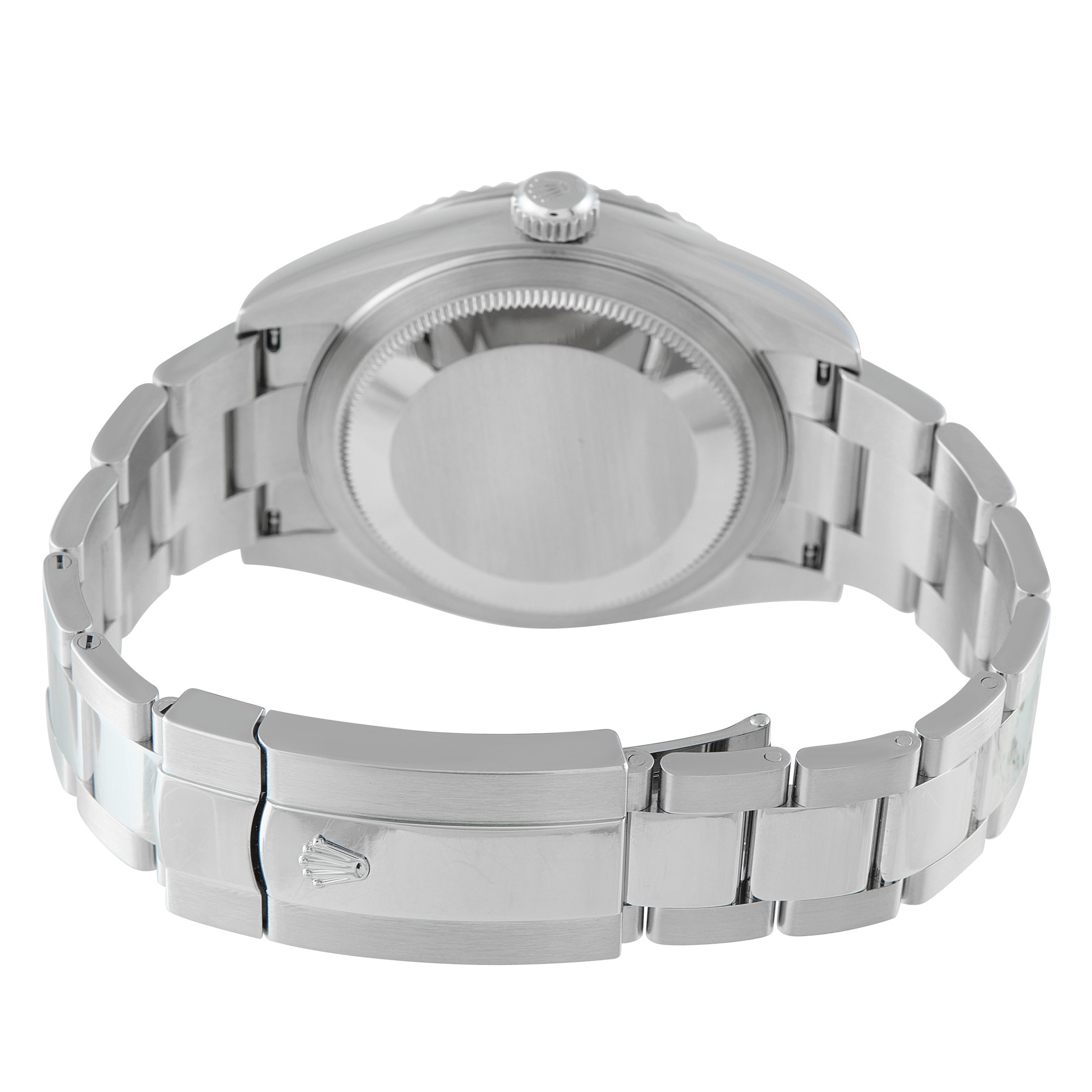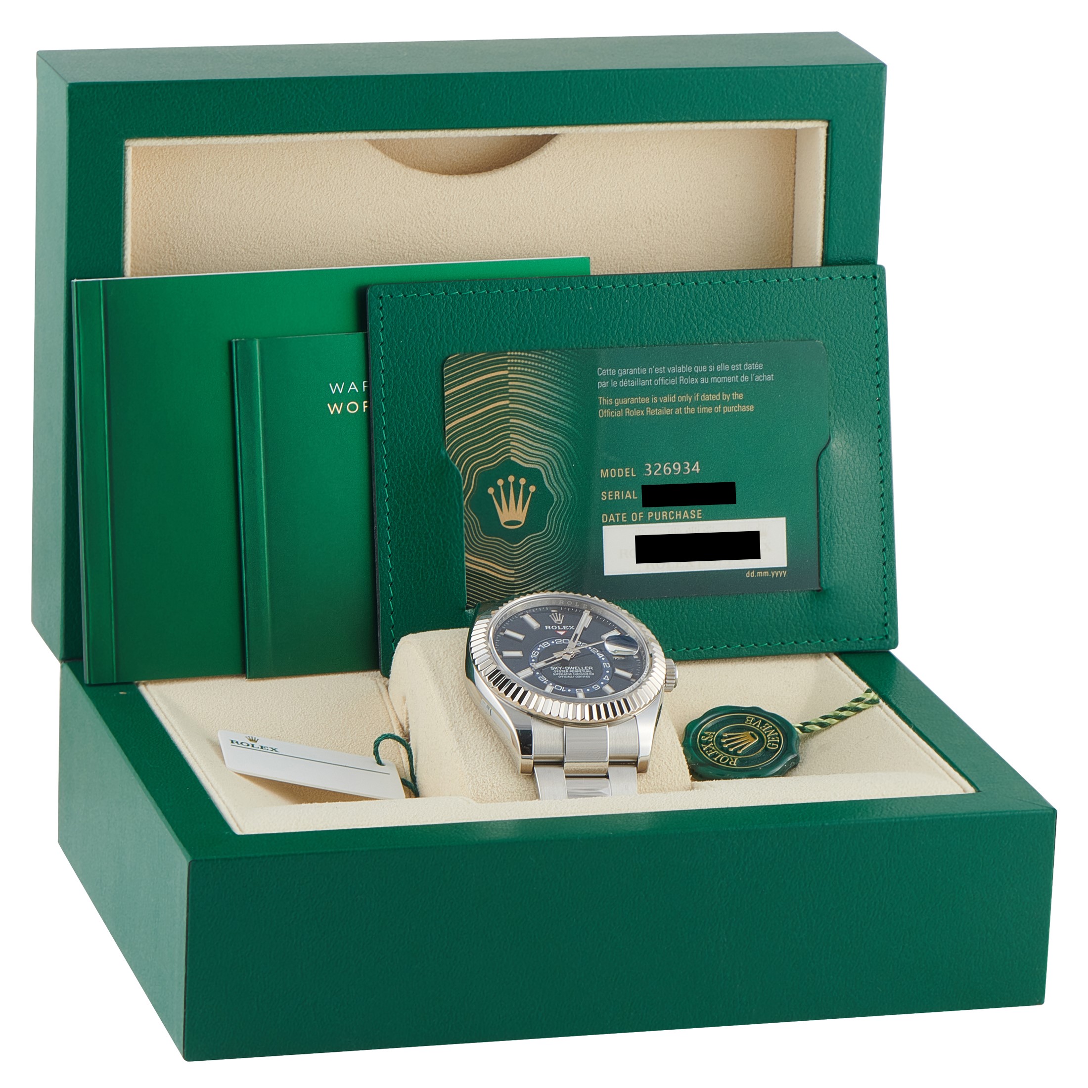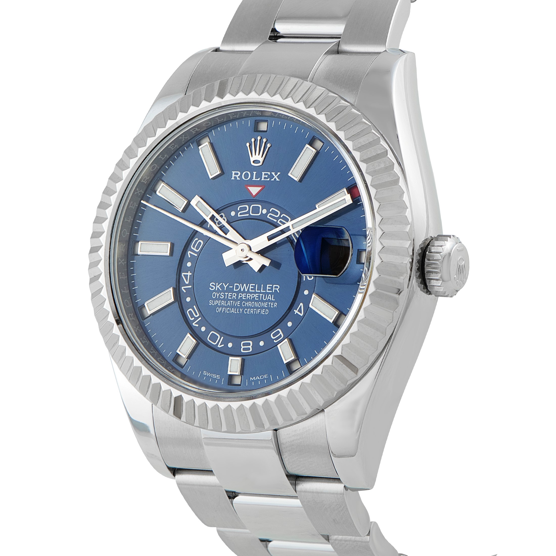 The watch built for global schedules. The Sky-Dweller ref. 326934 demonstrates technical capacity through its multi-functional interface. A 42mm Oystersteel case is framed by an 18k white gold fluted bezel, which operates the Ring Command System to adjust local time, home time, and the calendar. The sunray blue dial tracks dual time via an off-center 24-hour disc, while the annual calendar marks months through discreet apertures at each hour. Automatic Caliber 9001 delivers a 72-hour power reserve and instantaneous date change, regulated to Superlative Chronometer standards. The watch is fitted to an Oyster bracelet.Offered pre-owned, this Rolex Sky-Dweller Blue Dial White Rolesor Watch 326934 comes with papers and the manufacturer's box.