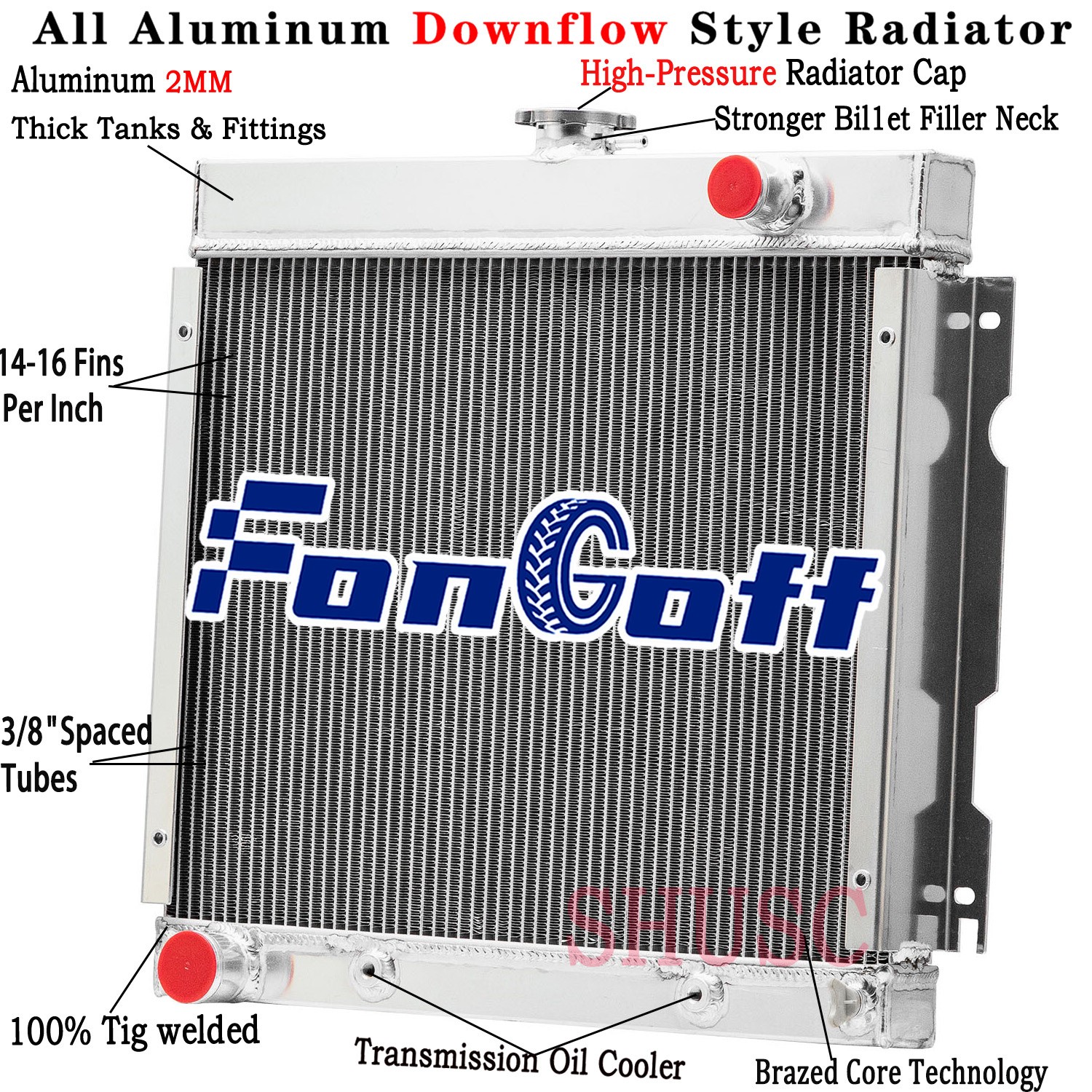 This Aluminum Radiator is designed to provide maximum cooling efficiency to prevent premature engine failure. Its light-weight, and high-heat transferring aluminum features a tube and fin design that, dramatically increases surface area that enables the heat to dissipate more efficiently. This Aluminum Radiator is at least 30%-45% more efficient than stock ones. Most importantly, it has a much higher capacity for coolant than stock ones, which means that your cooling system will be more efficient and will be more resistant to temperature surges in racing applications.