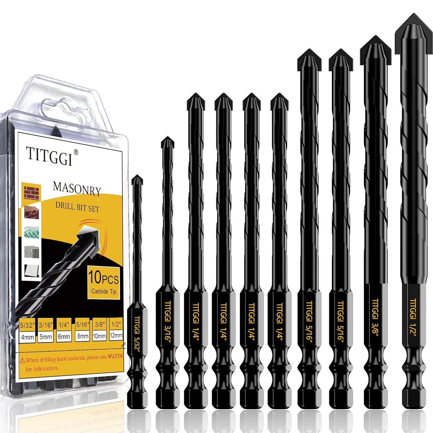 - HIGH QUALITY DRILL BIT SET; TITGGI concrete drill bit set, drill bit tip made of high-quality YG6X hard alloy, fully polished and rustproof, clean and sharp without burrs. This masonry drill bit can easily penetrate various material (glass, ceramic, cement, wood, brick, hard plastic, etc.)