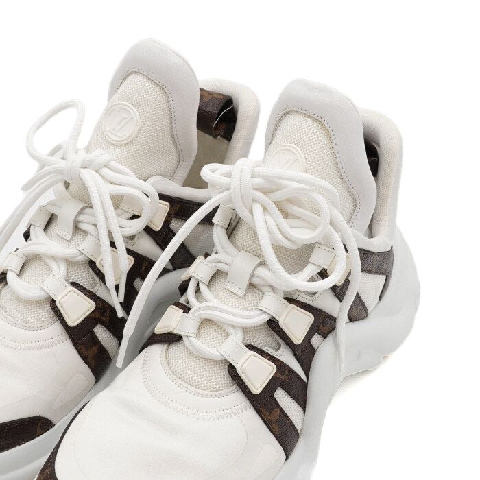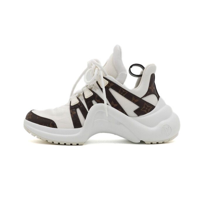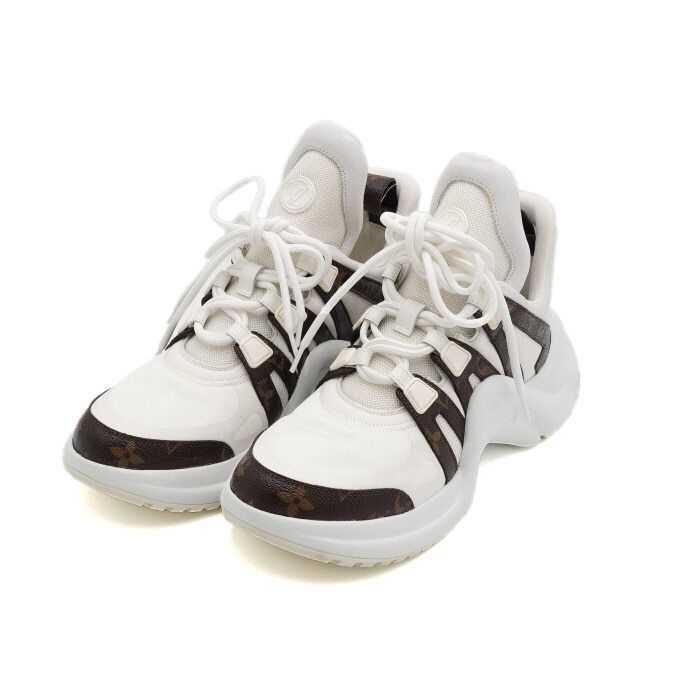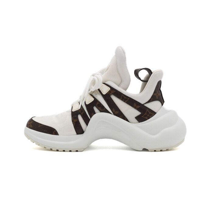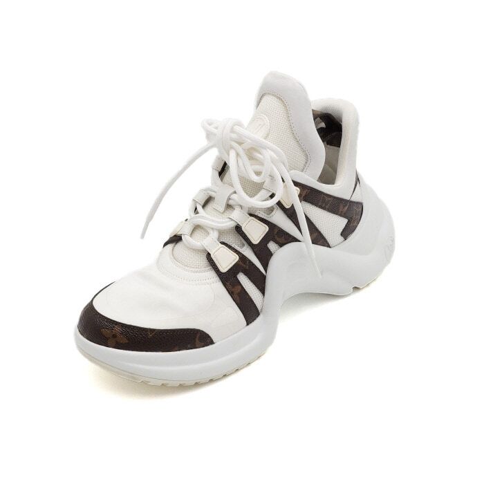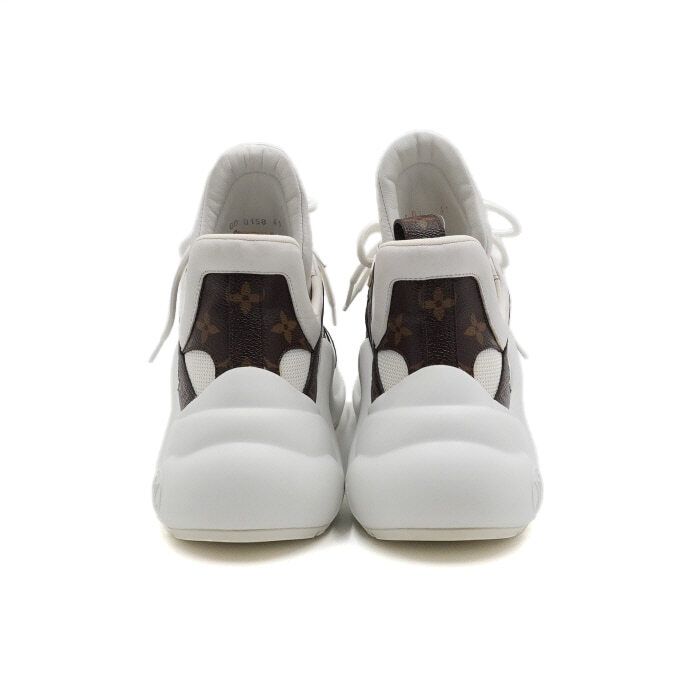 - Futuristic design showcased at the 2018 Spring-Summer fashion show. - Features a wavy outsole for elasticity and an oversized tongue. - Low-cut ankle design adds a delicate, feminine touch. - Made of patent monogram canvas and functional textile. - Height-boosting elastic rubber outsole: 5 cm. - Upper material: Polyester, genuine leather (cow, sheep). - Lining: Polyester, genuine leather (goat). - Suitable for both men and women. - Natural signs of wear but overall in good condition. - No accessories included. - Gender: Women - Brand: LOUIS VUITTON - Product Name: Louis Vuitton Monogram Archlight Sneakers 1A43L7 152317318 - Condition: A+ - Color: White - trenbe Code: 152317318 |