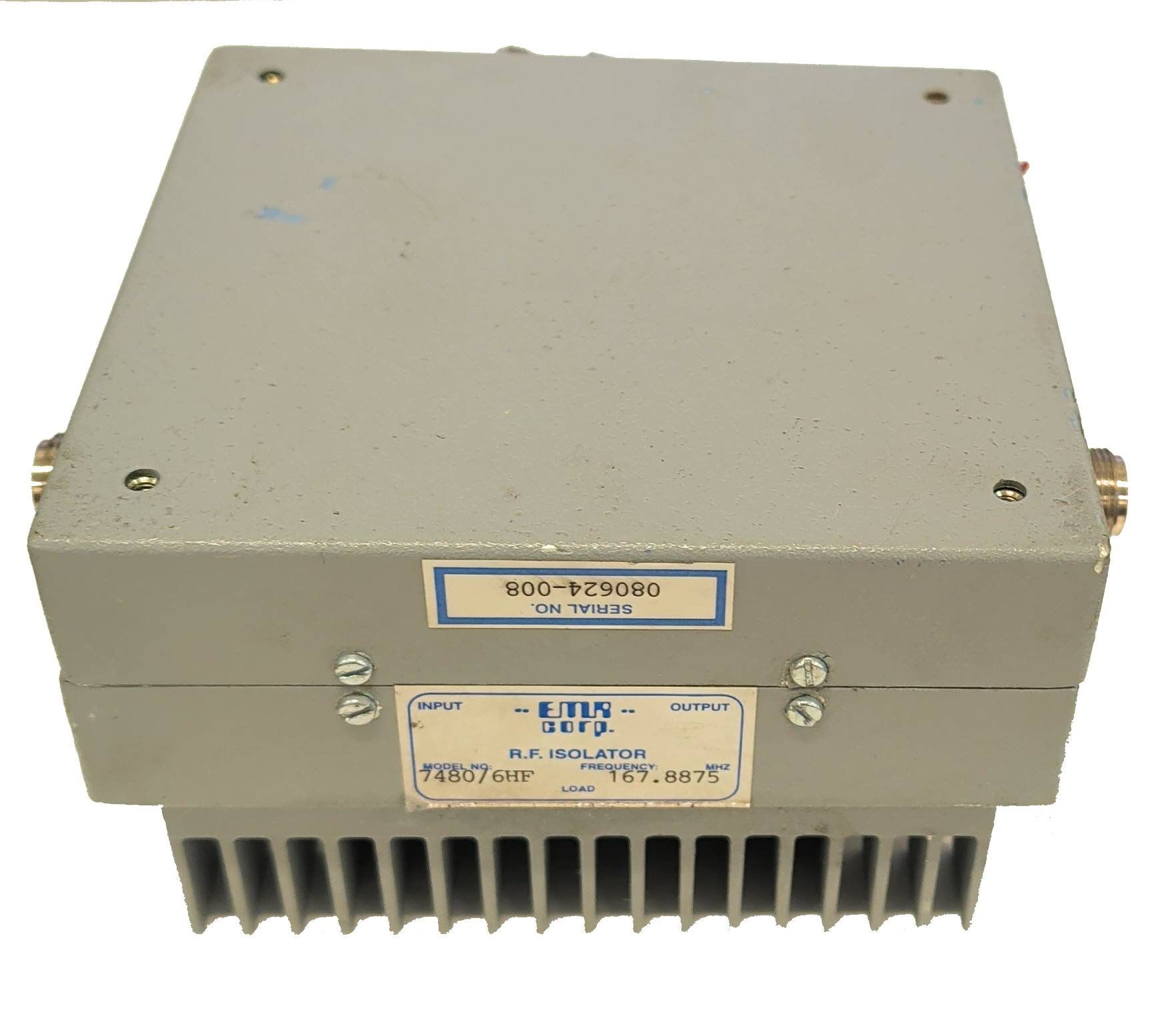 This is an EMR 7480/6HF RF single isolator designed for reliable signal protection in high-power RF systems. Rated for 250 watts at 167.8875 MHz, it helps safeguard transmitters by minimizing reflected power. Featuring N connectors, this isolator is well suited for broadcast, public safety, and communications installations.