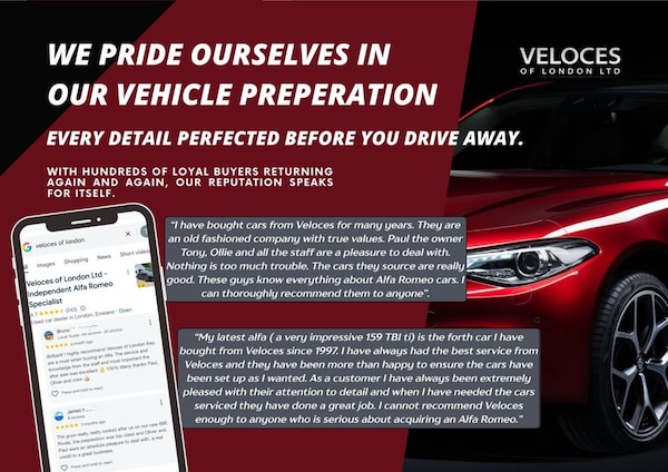 Veloces is the UK's leading independent Alfa Romeo specialist. With over 25 years Alfa experience we pride ourselves in stocking the best quality new and used Alfas for sale. With top Alfa Romeo trained mechanics, a fully equipped workshop and insurance approved bodyshop, Veloces of London is the place to come!