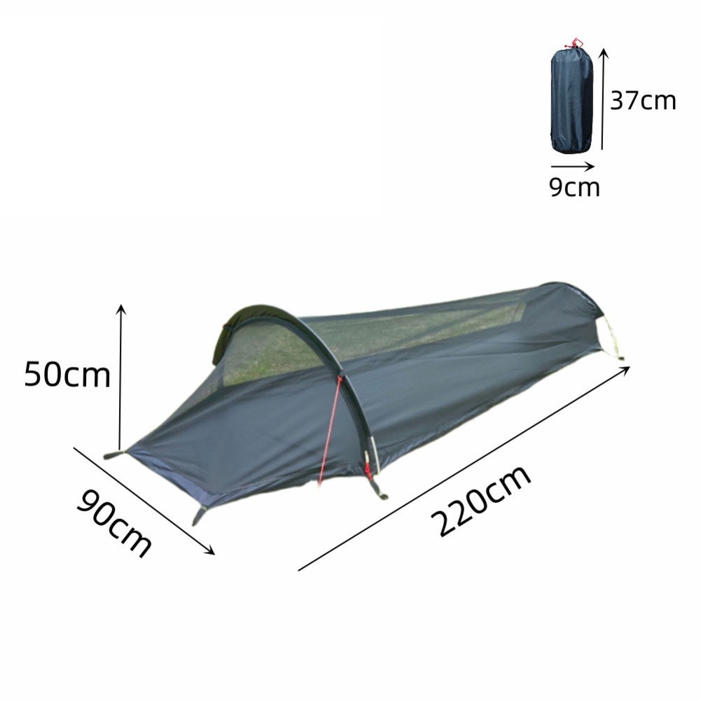 Spécifications : *Nom du produit : Tente monocoque (tente à simple paroi) *Matériaux : Tissu de la tente : gaze 40D ; tissu du plancher : toile Oxford 210D ; revêtement étanche du plancher : PU 4000 ; structure porteuse : mâts en alliage d’aluminium aéronautique haute résistance *Dimensions : Dimensions de la tente : longueur 220 × largeur 90 × hauteur 50 cm ; poids : 0,7 kg ; dimensions rangées : 37 cm de longueur, 9 cm de diamètre *Couleur : noir