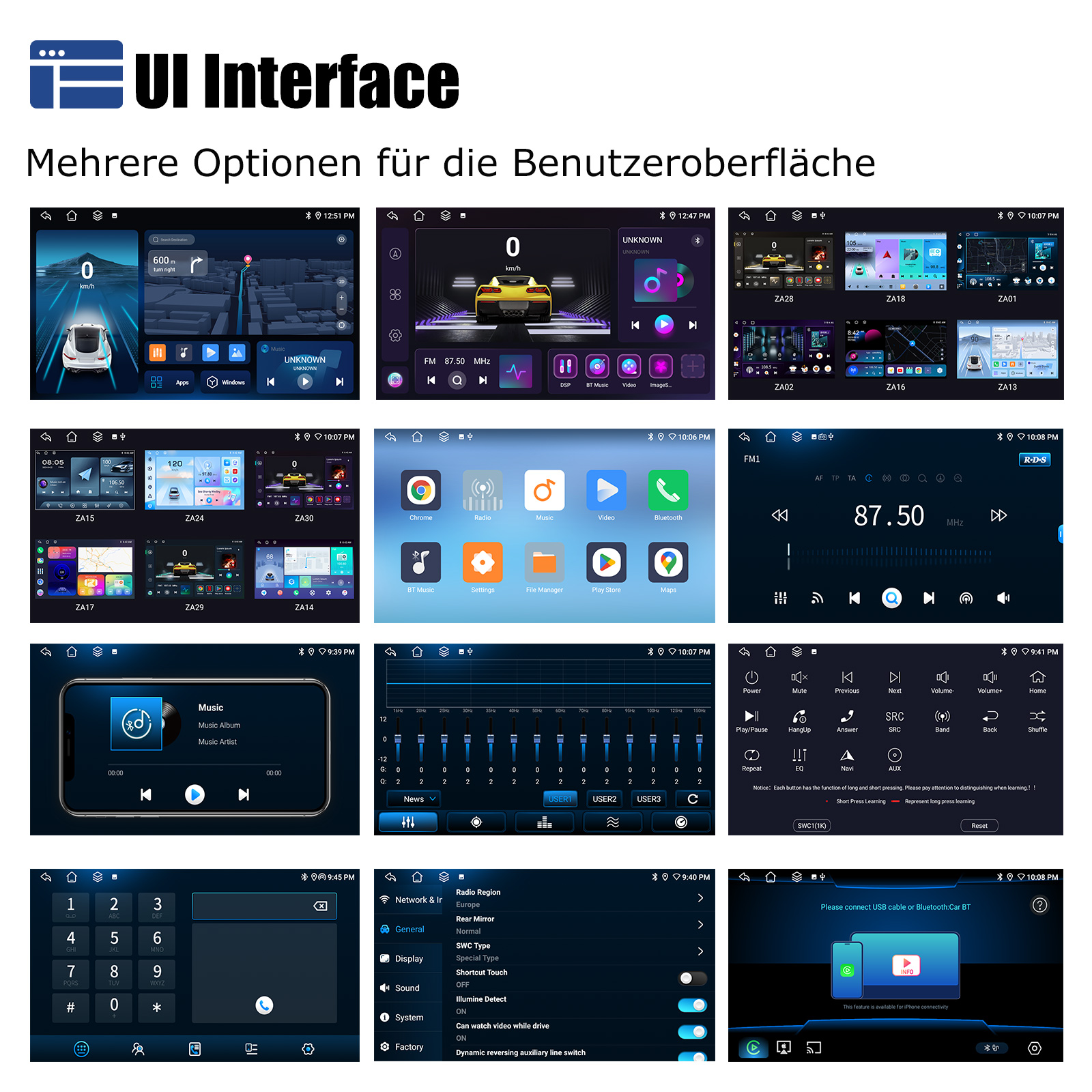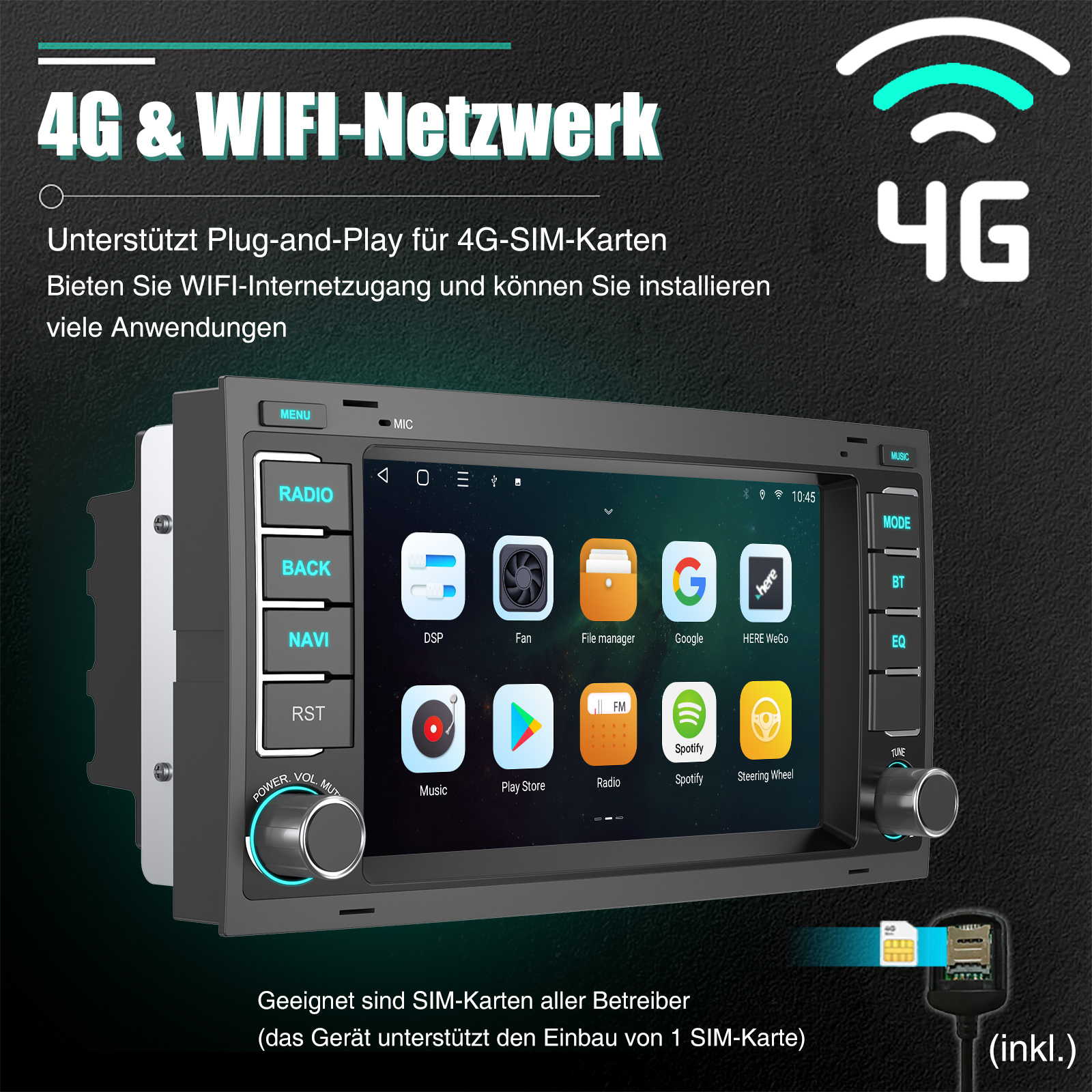 FM/AM/RDS-Radio und Bluetooth und DSP-Sound: Unterstützt Bluetooth 5,0, mit integriertem Mikrofon, damit Sie während der Fahrt freihändig telefonieren können. Unterstützt den Zugriff auf das Telefonbuch, die Musikwiedergabeschnittstelle usw. RDS unterstützt. Sie können 18 FM und 12 AM Radiosender speichern. Eingebauter DSP-Chip. Unterstützt 48-Band-EQ-Einstellung, Mit der DSP-Funktion können Sie den Klang jedes Lautsprechers mithilfe verschiedener Entzerrungsmethoden individuell anpassen: Jazz, Rock, Pop, Klassik usw., um einen außergewöhnlichen Höreffekt für Sie zu erzielen!, die nach Ihren persönlichen Vorlieben eingestellt werden kann. 4 x 45W Verstärker, Surround-Sound und Subwoofer-Ausgang.