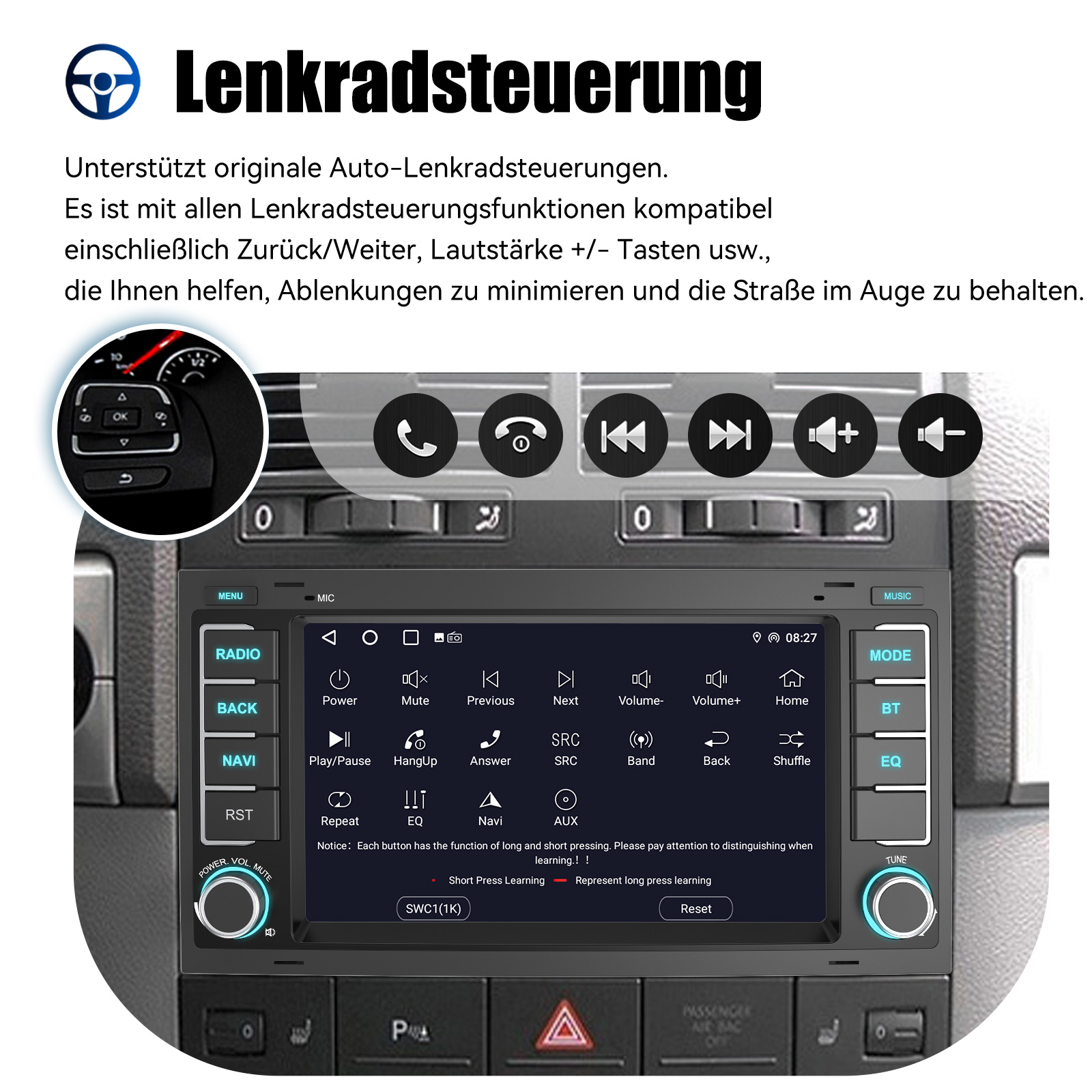 AHD Rückfahrkameraeingang und Lenkradkontrolle: Nach dem Anschluss an die Rückfahrkamera. Das Radio zeigt automatisch das Rückfahrbild an, sobald Sie den Rückwärtsgang einlegen. Machen Sie Ihr tägliches Rückwärtsfahren sicherer. Unterstützt die originale Auto-Lenkradsteuerung (wenn Ihr Auto Canbus nicht unterstützt und SIE die Lenkradtasten lernen), um das Fahren bequemer und sicherer zu machen.