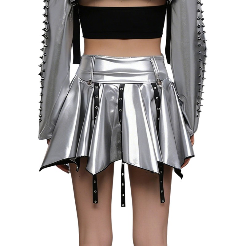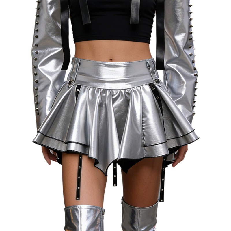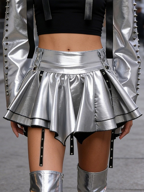 Die metallisch glänzende Oberfläche verleiht dem Rock einen Hauch von Glamour und lässt ihn besonders gut zur Geltung kommen – perfekt für die neuesten Modetrends.
